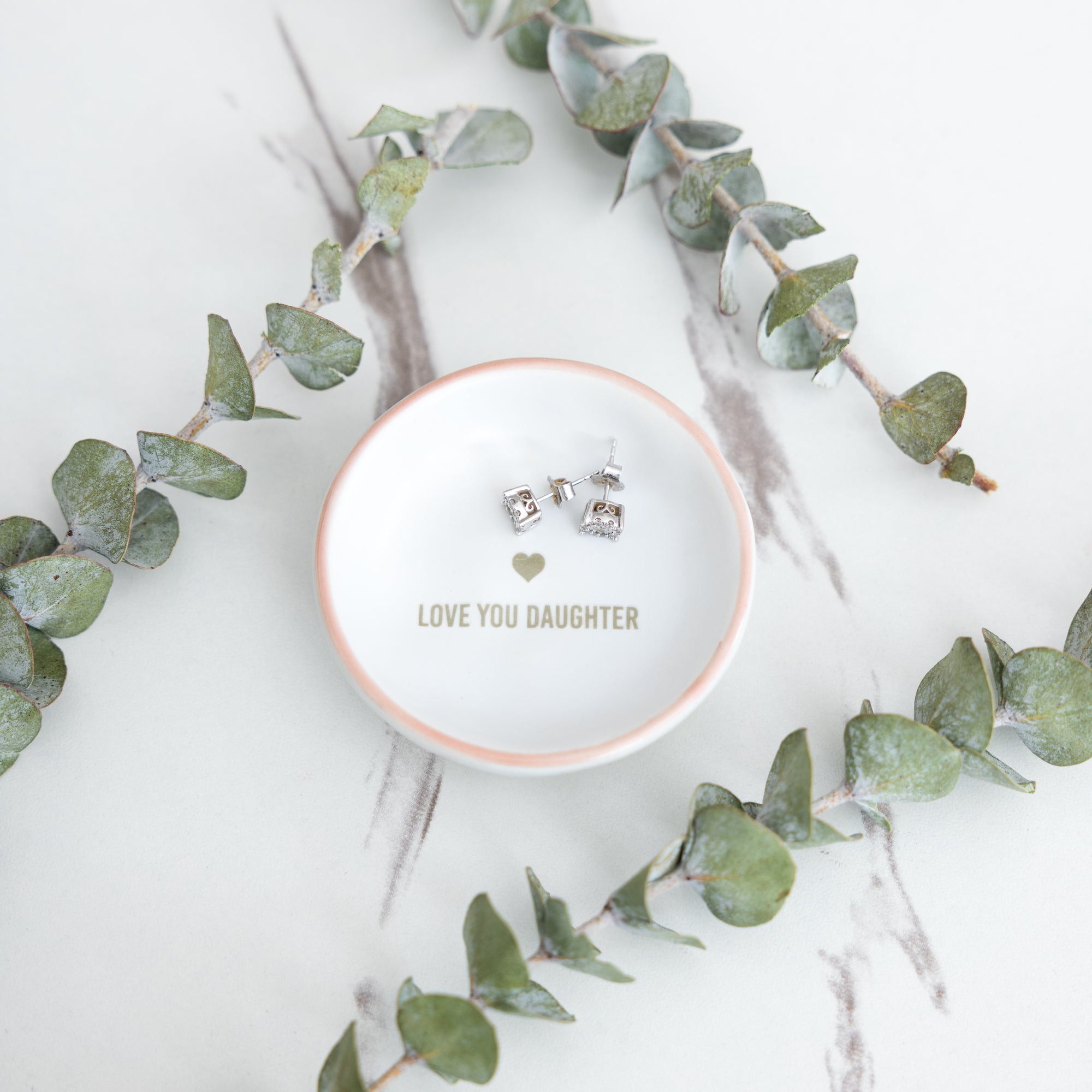 - IN-HOUSE DESIGN: The finish is matte white with a glossy pink brim. The gray "Love You Daughter" glossy risen sentiment is accompanied by a heart.