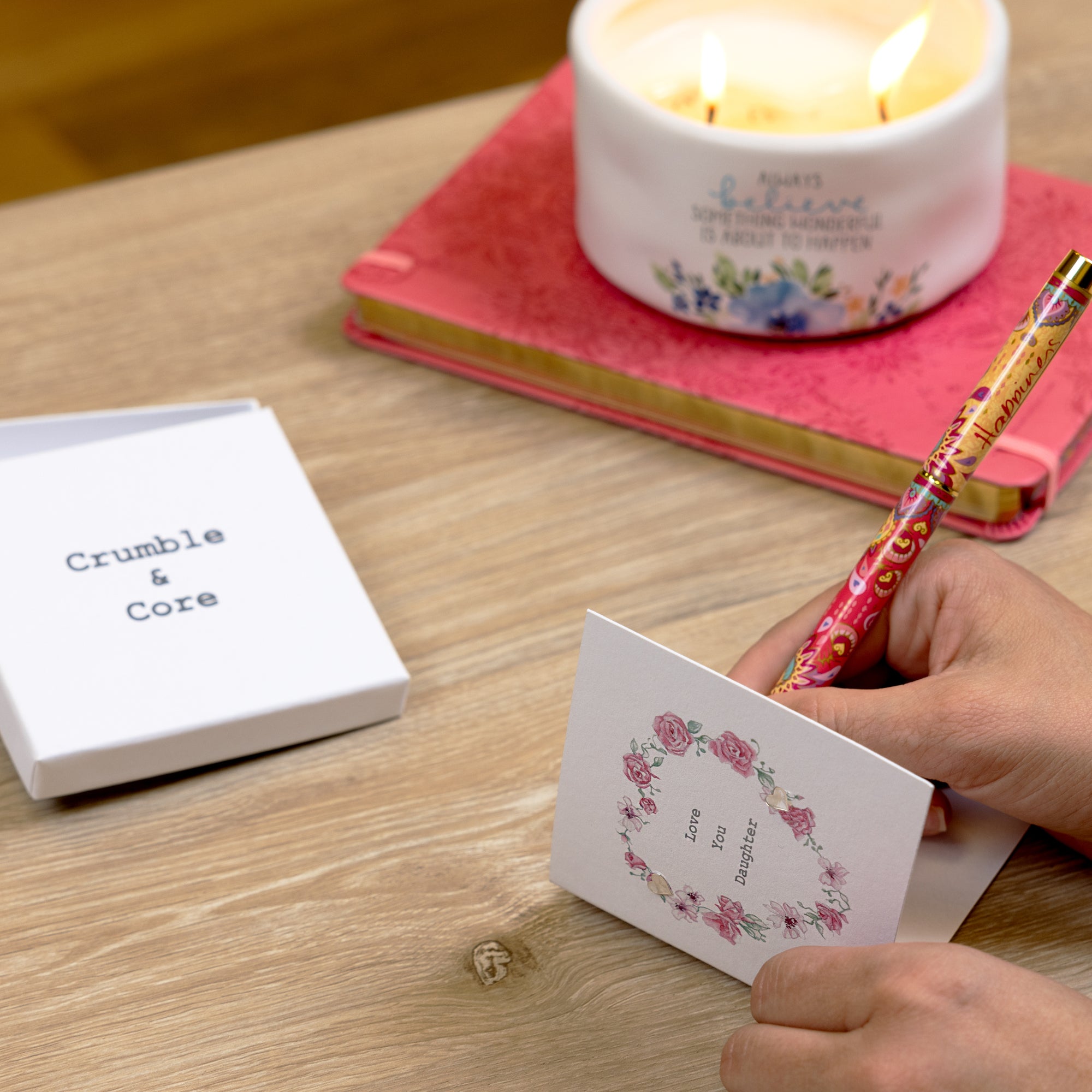 - IN-HOUSE DESIGN: The cheerful celebratory printed watercolored beautiful pink rose and cherry blossom heart-shaped wreath design with the earrings strategically placed within the florals. The typewritten style gray "Love You Daughter" sentiment is placed in the center.