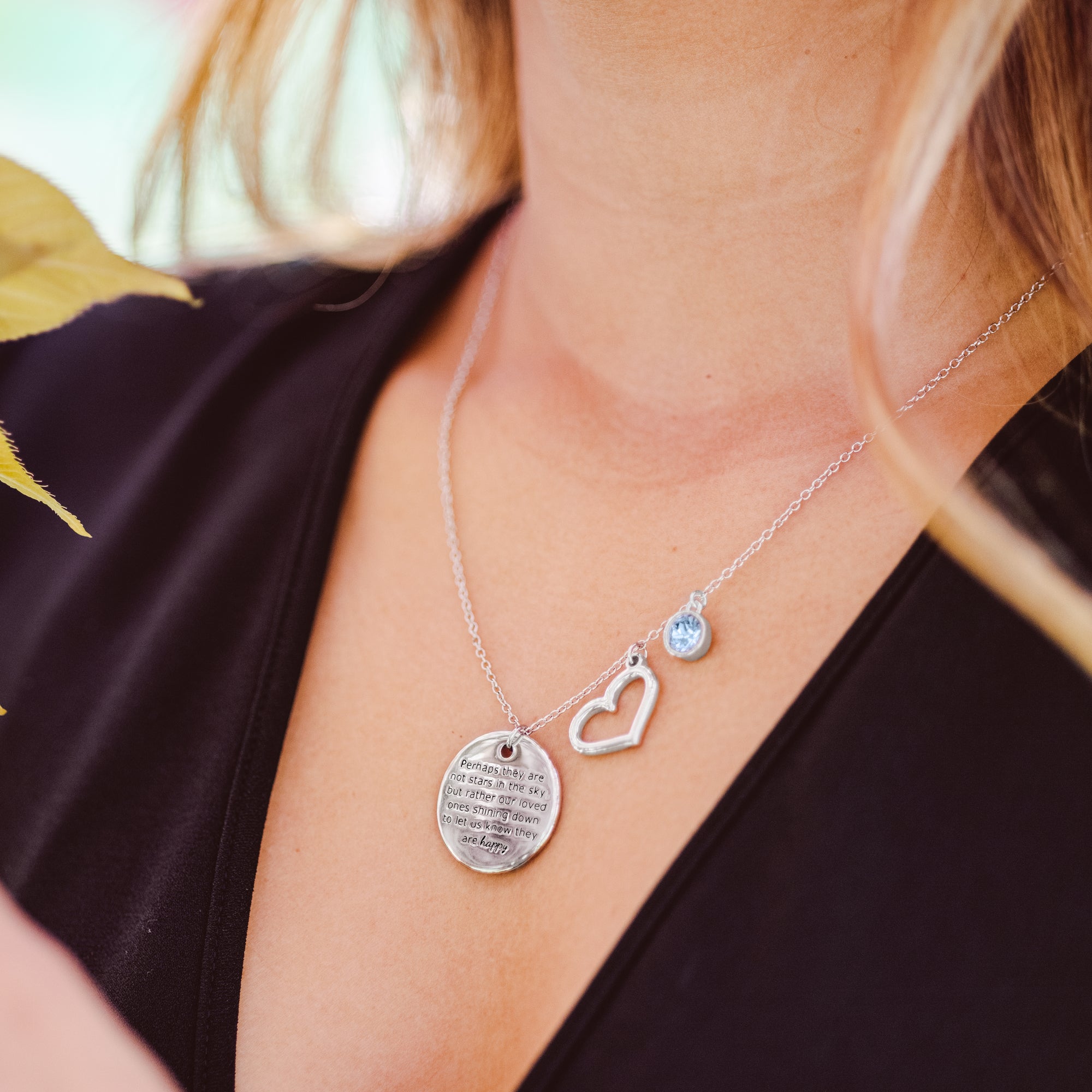 - IN-HOUSE DESIGN: The coin pendant, “Perhaps they are not stars in the sky, but rather our loved ones shining down to let us know they are happy” and has a sapphire-colored crystal to create a beautiful light blue color for her to wear. The pendant is free floating to ensure a perfect fit on your neck.