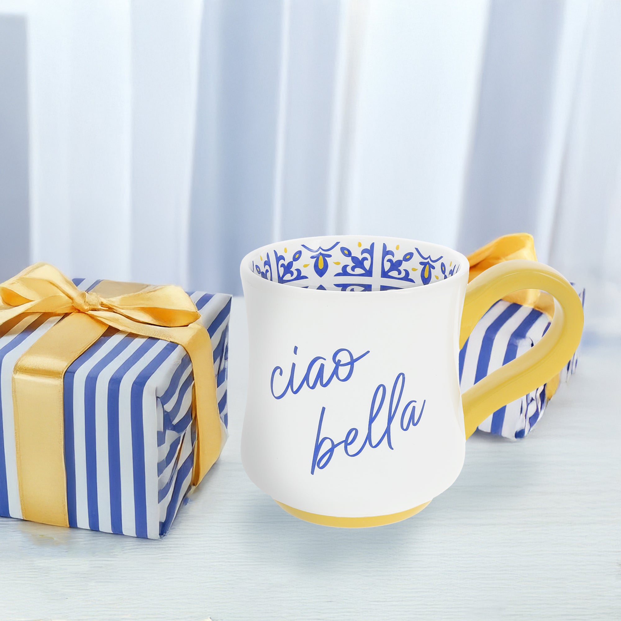 - IN-HOUSE DESIGN: Capturing the elegance of Italy, this mug features a deep blue and white tile interior, a cheerful golden-yellow handle, and the phrase "Ciao Bella" printed in stylish script. Its charming design is reminiscent of Italy’s picturesque towns and rich culture.