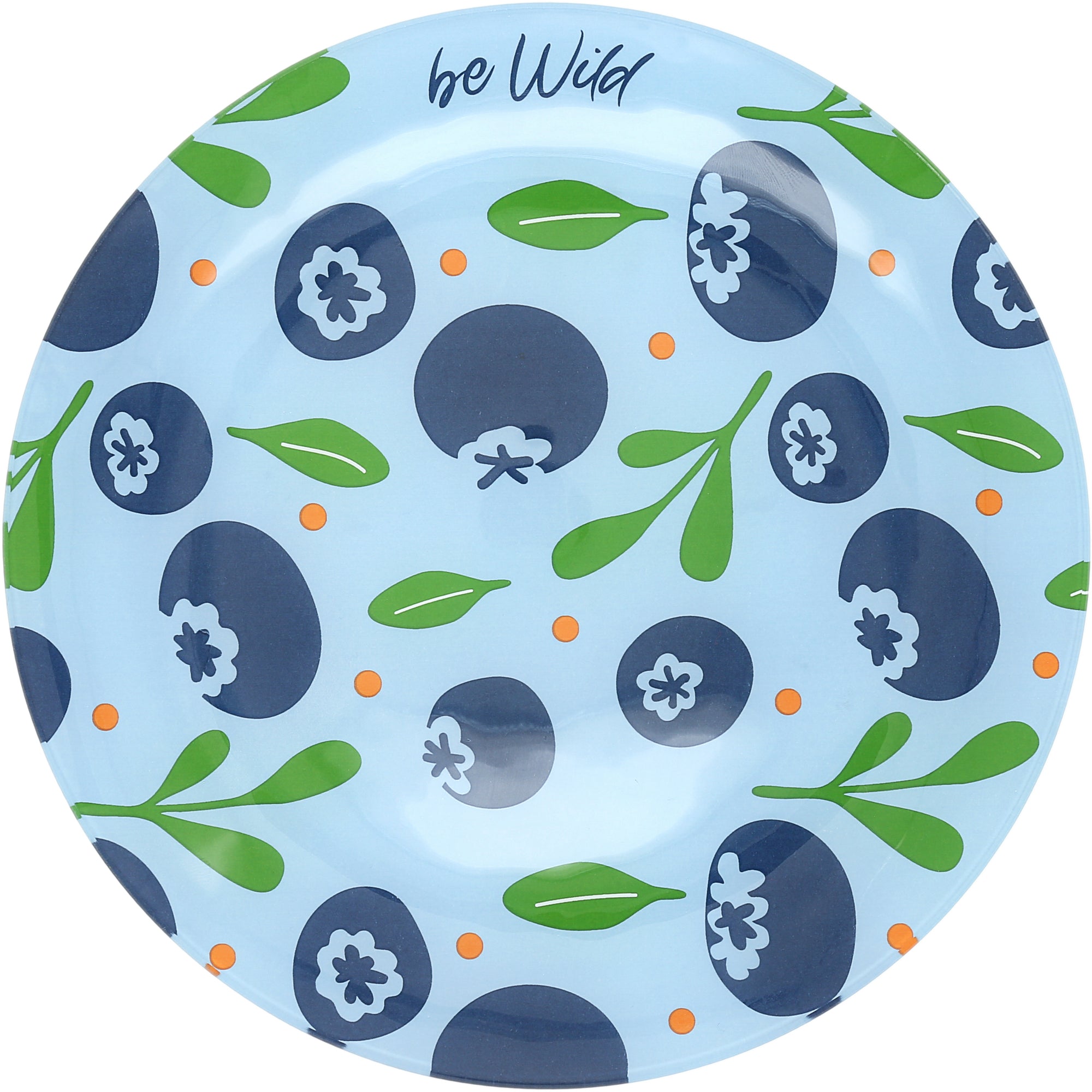 - IN-HOUSE DESIGN: The blue background encompasses blueberries and greenery and is accompanied by orange polka dots. The "Every Day Is A Fresh Start" sentiment is on the rim of the appetizer plate.