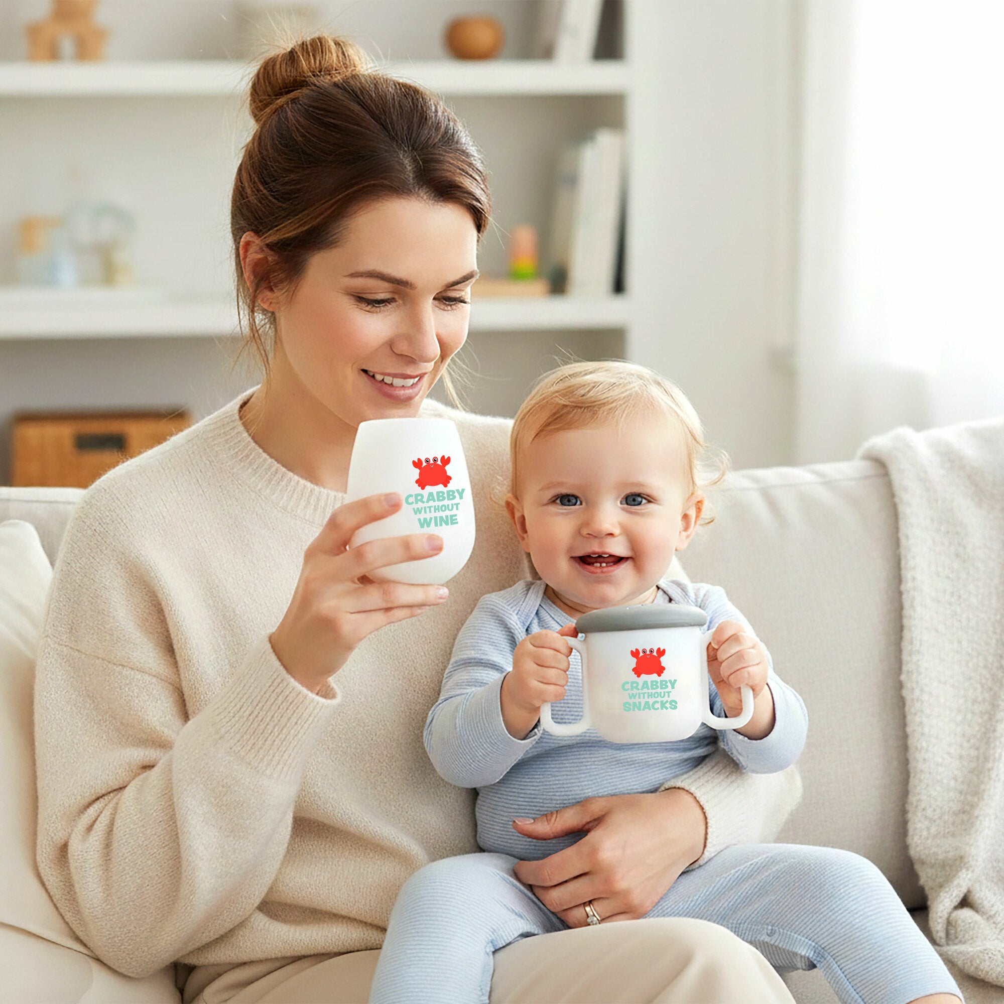 • IN-HOUSE DESIGN: Features a bright red crab with playful coordinating sayings—“Crabby Without Wine” for Mom and “Crabby Without Snacks” for little ones. The smooth matte finish, rounded edges, and raised interior artwork add visual charm while making the cups easy for small hands to grip.
