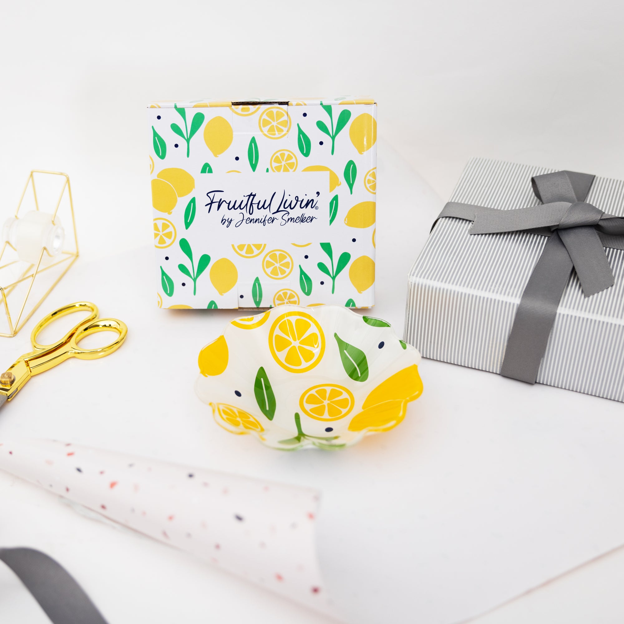 - IN-HOUSE DESIGN: Large bold whole and halved lemons are accompanied by greenery and blue polka dots on a white background.