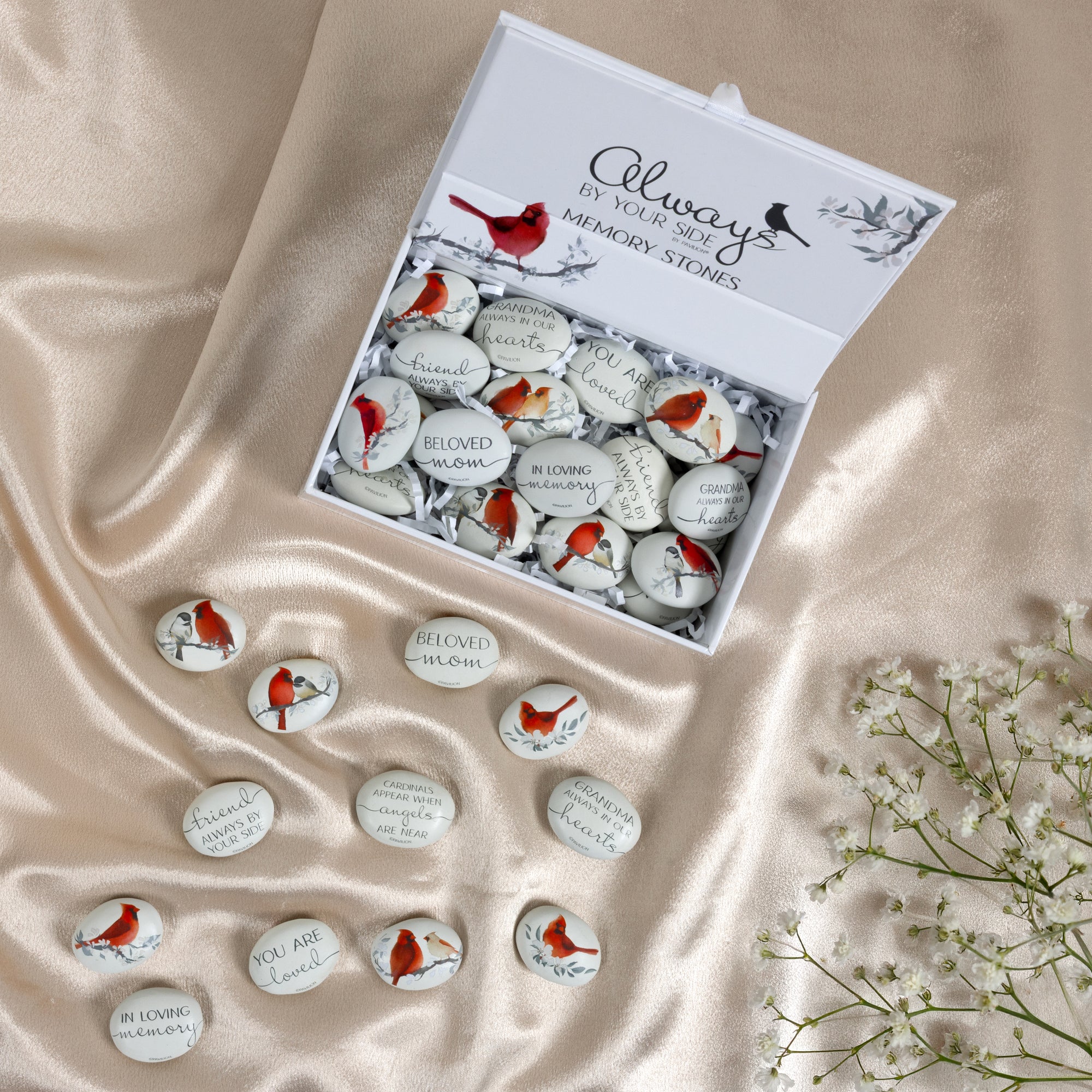 - PREMIUM QUALITY: Each 1.5" oval memory stone is crafted from resin with a natural river rock texture and white painted finish. Featuring detailed printed artwork and sentimental messages, each design includes a glossy cardinal illustration on one side and an engraved message on the back. Messages include “In Loving Memory,” “You Are Loved,” “Beloved Mom,” “Cardinals Appear When Angels Are Near,” “Friend Always By Your Side,” and “Grandma Always in Our Hearts.” Packaged in an elegant display box holding 24 assorted stones for retail or gifting.