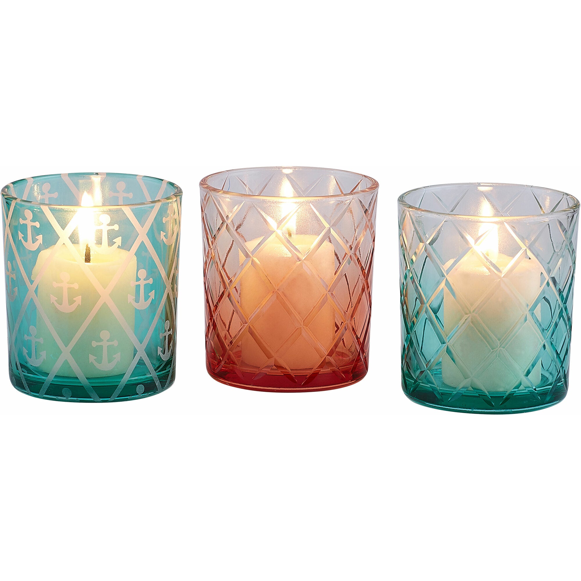• IN-HOUSE DESIGN: Blue anchor design is printed on one of the candle holders, while the other two feature diamond-shaped glass detailing.