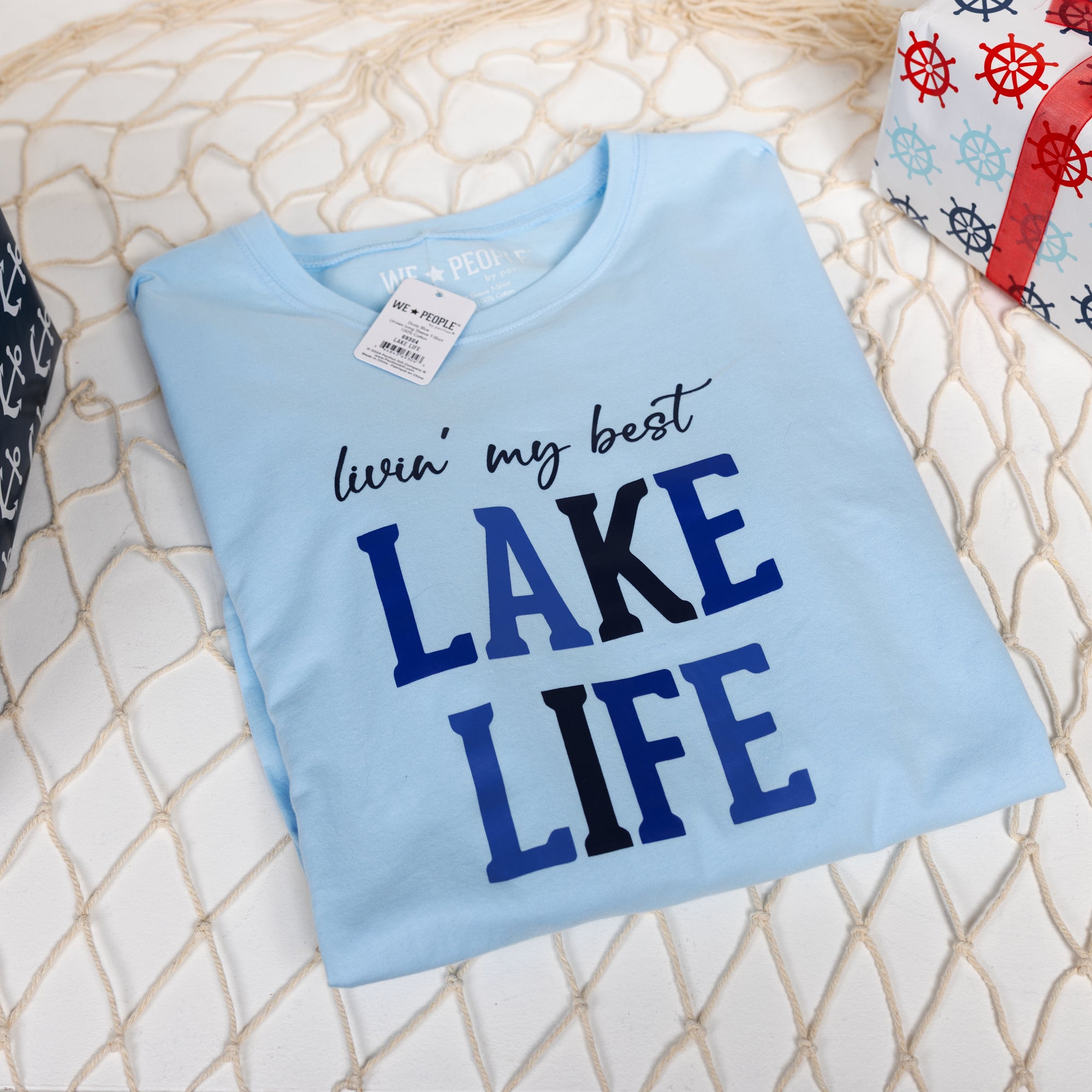 - IN-HOUSE DESIGN: This shirt proudly features the phrase "Lake Life" printed in bold, deep blue lettering on the front, encapsulating the calm, refreshing spirit of lakeside living. The typography is clean and stylish, blending seamlessly with the shirt’s soft, natural color to create a laid-back aesthetic. With its understated elegance, this shirt is a timeless nod to days spent boating, fishing, swimming, or simply relaxing at the lake.
