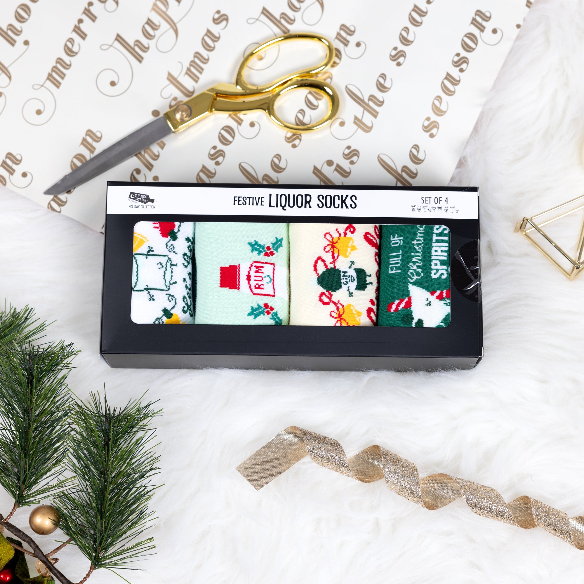 - IN-HOUSE DESIGN: The second pair is green, including a red mistletoe wrap-around design; the top of the socks has a smiling rum bottle and an "I Put The Rum in Rum-Pa-Pa-Pum" sentiment. The third pair is yellow & red, including a bell and ribbon wrap-around design; the top of the socks has a smiling gin bottle and a "Gin-gle All The Way" sentiment. The fourth pair is green with a wrap-around candy cane design; the top of the socks has a smiling martini glass with a "Full Of Christmas Spirits" sentiment.