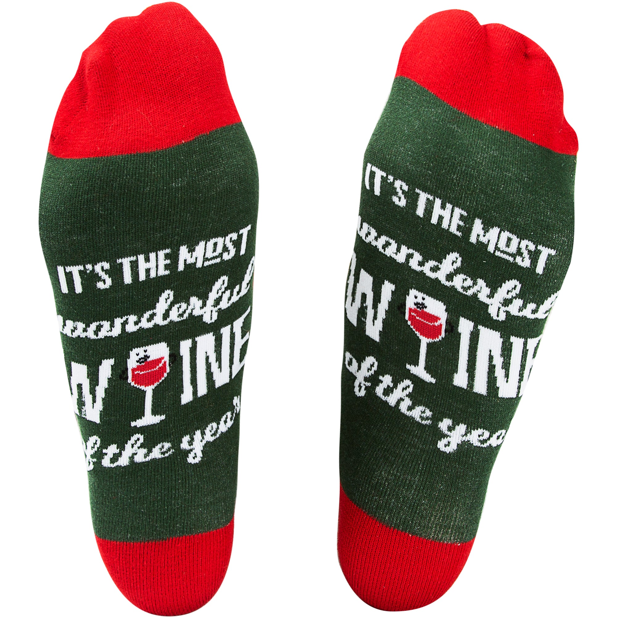 • IN-HOUSE DESIGN: "It's The Most Wonderful Wine Of The Year" text decal and accompanying alcohol imagery decal is applied to the front of the ornament, while socks feature sewn-in wine glasses and snowflakes.