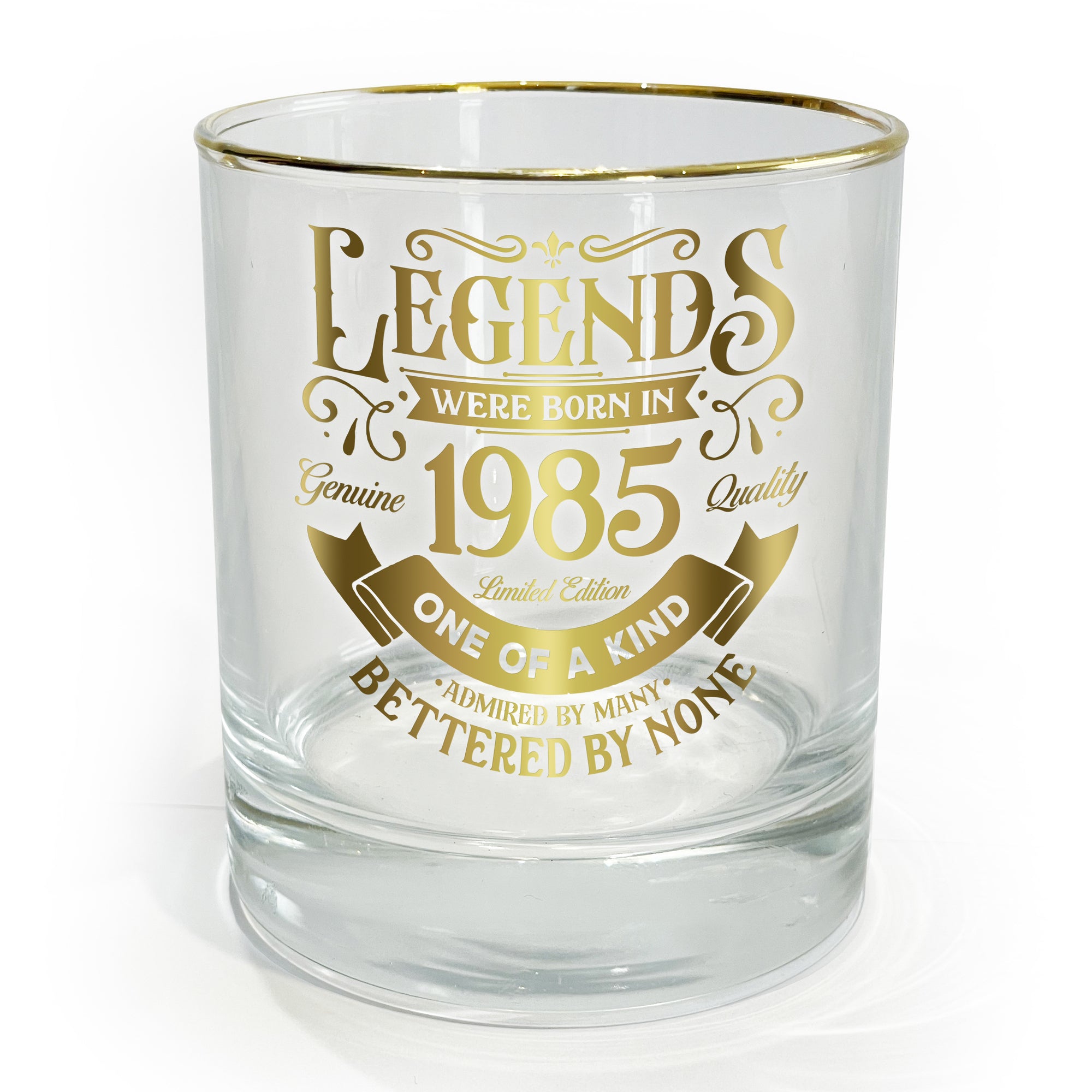 - IN-HOUSE DESIGN: The gold electroplated rim is accompanied by the gold "Legends Were Born In 1985, Genuine Quality, Limited Edition, One Of A Kind, Admired By Many, Bettered By None" sentiment decal on the front side of the whiskey along with banners and stars.