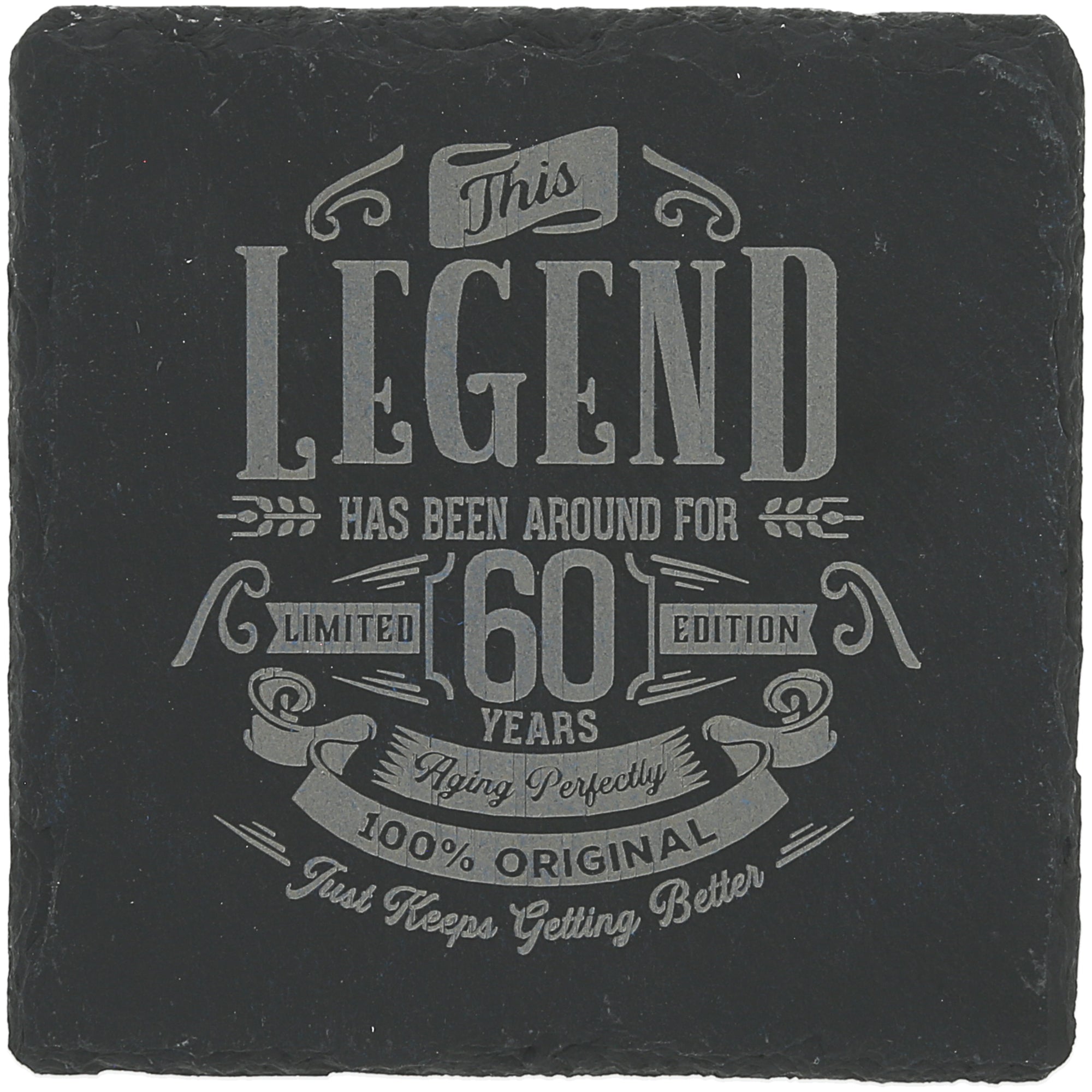 - PREMIUM QUALITY: This 4" x 4" slate coaster features engraved detailing and foam feet for stability. Its durable slate design makes it both functional and stylish, with the sentiment "This Legend Has Been Around For 60 Years Limited Edition Aging Perfectly 100% Original Just Keeps Getting Better" deeply engraved for a lasting impression.