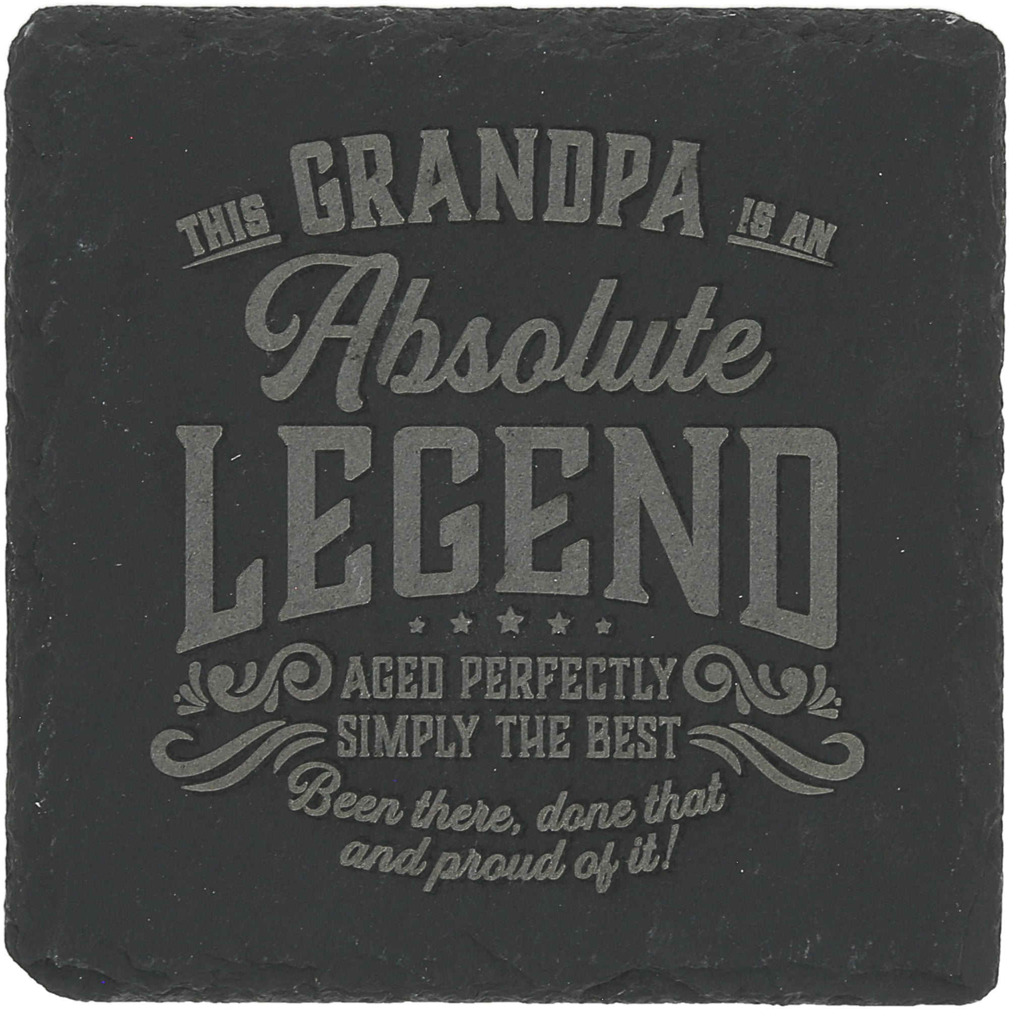 - PREMIUM QUALITY: This 4" x 4" slate coaster features engraved detailing and foam feet for stability. Its durable slate design makes it both functional and stylish, with the sentiment "This Grandpa Is An Absolute Legend Aged Perfectly Simply The Best Been There, Done That And Proud Of It!" deeply engraved for a lasting impression. | **IN-HOUSE DESIGN:** The coaster boasts ridged edges and a striking light gray engraved design on a dark gray background. It includes classic elements like banners and stars, making it visually appealing.