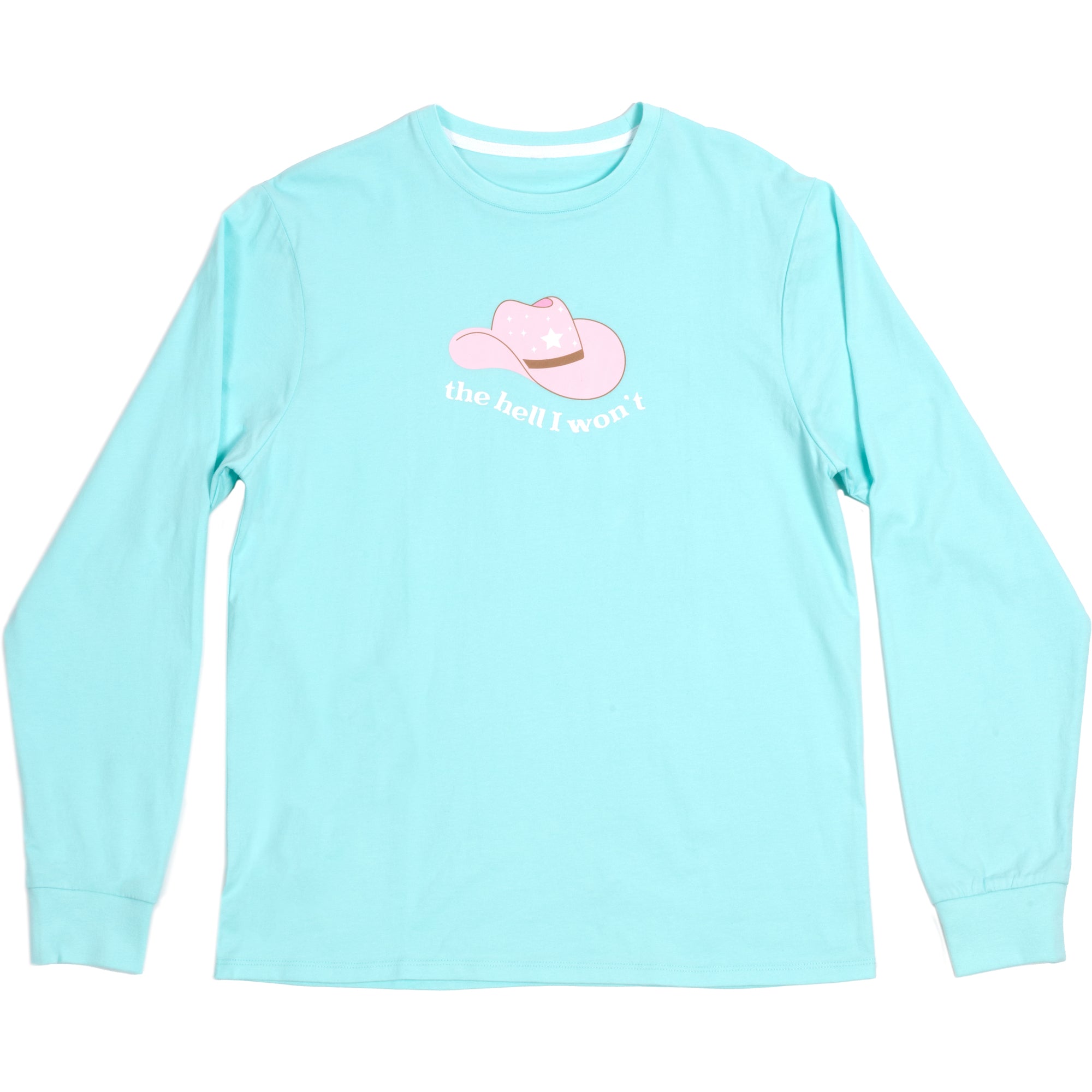 • IN-HOUSE DESIGN: Features a pastel pink cowgirl hat with embroidered-style printed stitching and the bold western-inspired phrase “the hell I won’t” beneath it. The artwork is vivid, durable, and crack-resistant, printed on a soft mint-aqua shirt that embodies the Let’s Go Girls™ modern cowgirl aesthetic. Confident, sassy, and empowering — a wearable statement of independence.