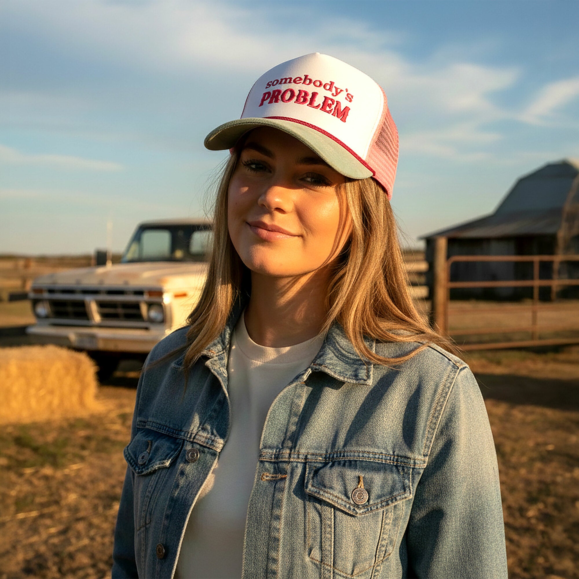 - IN-HOUSE DESIGN: Showcases bold pink embroidered text reading “somebody’s PROBLEM” across the white front panel, paired with a mint-green brim, mesh, and accent stitching. The cotton string trim along the brim adds a retro-western detail reminiscent of vintage cowgirl fashion. Bright, flirty, and full of attitude, this hat makes a statement without saying a word.