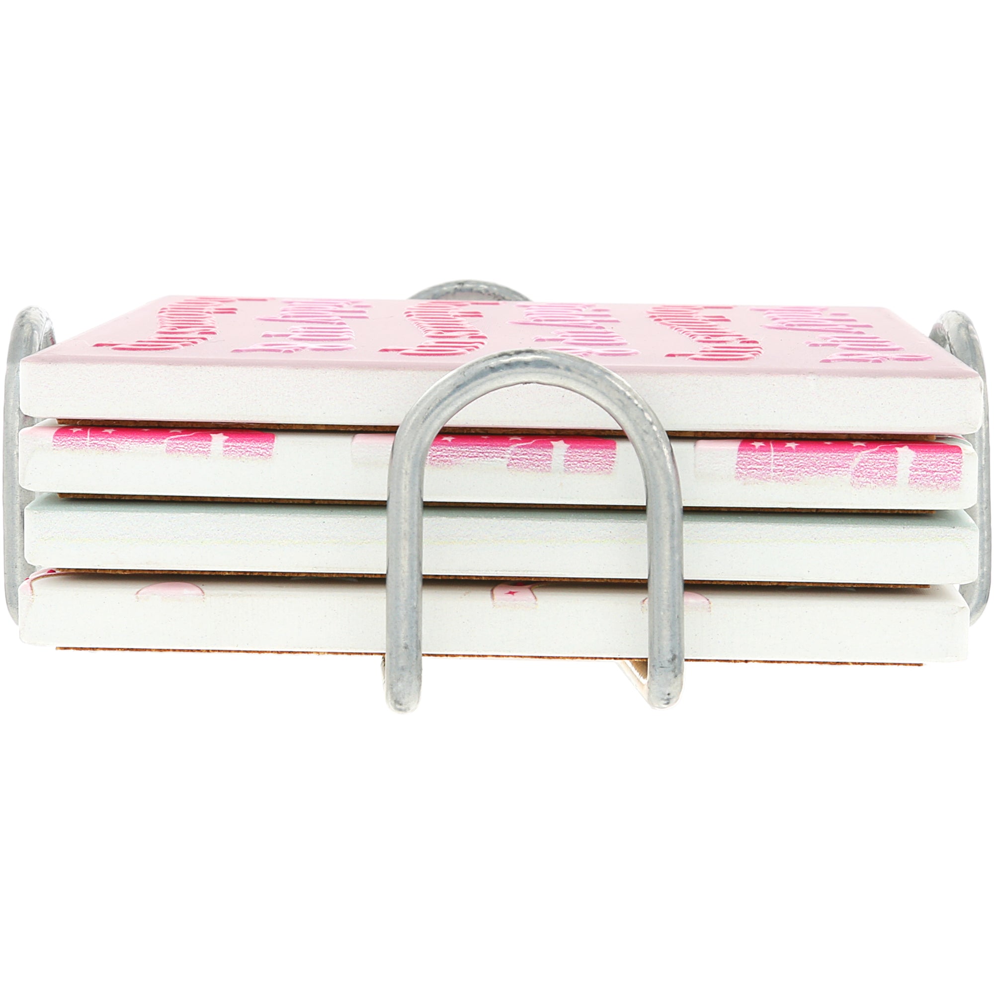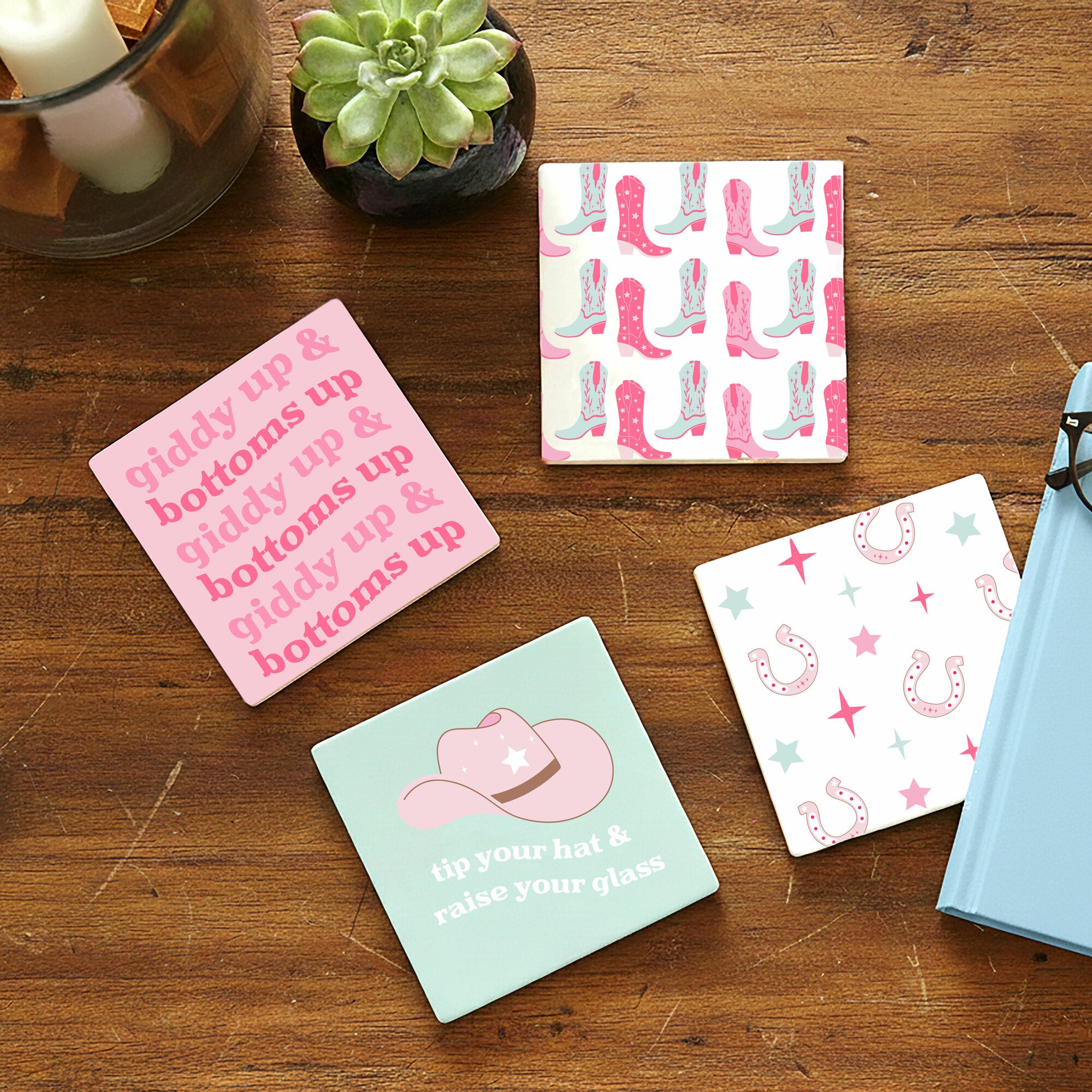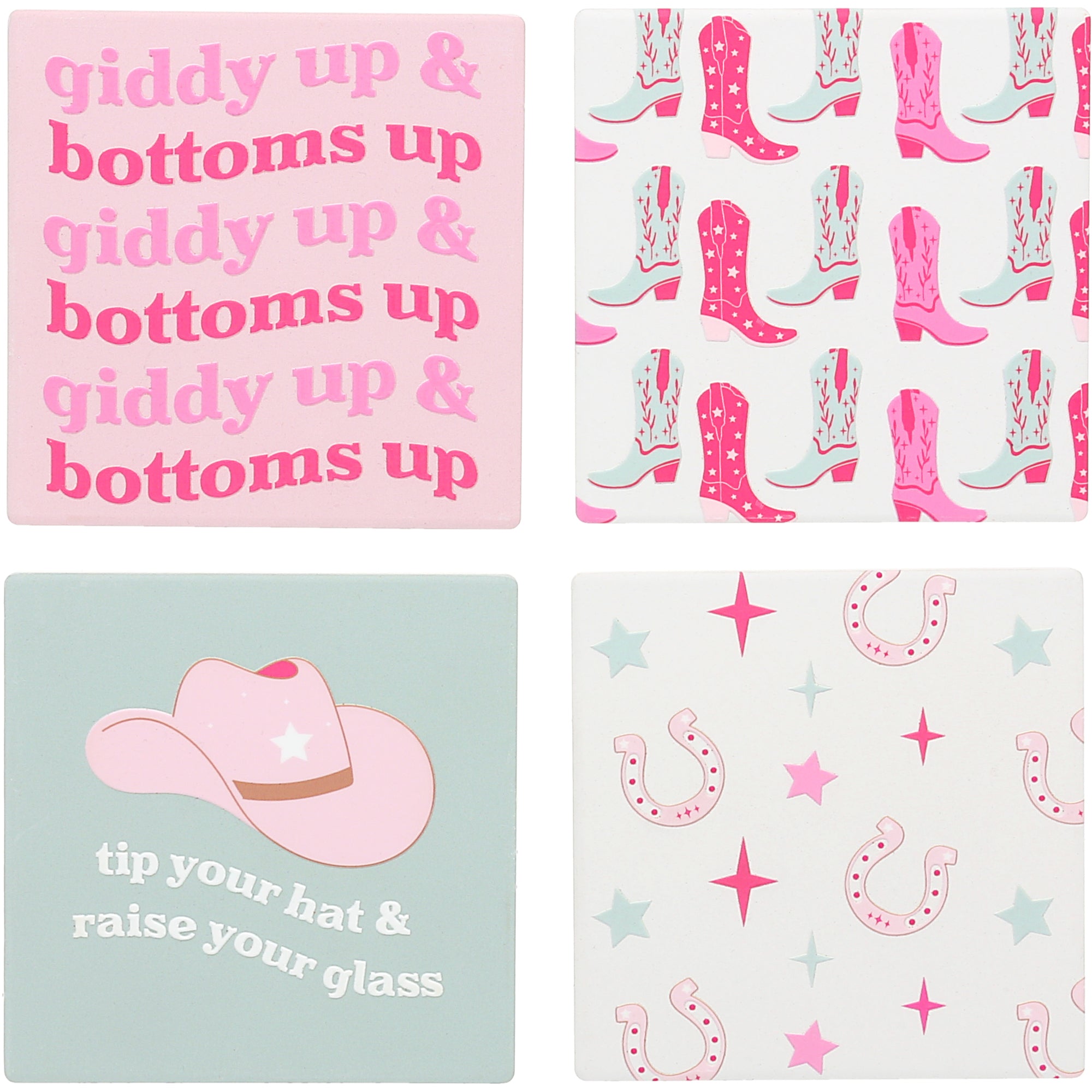 - IN-HOUSE DESIGN: Features four unique designs with bold cowgirl-themed sayings and graphics—“Giddy Up & Bottoms Up,” “Tip Your Hat & Raise Your Glass,” pink cowboy boots, and a pattern of lucky horseshoes and stars. Raised glossy accents add dimension and shine to each matte-finished tile.