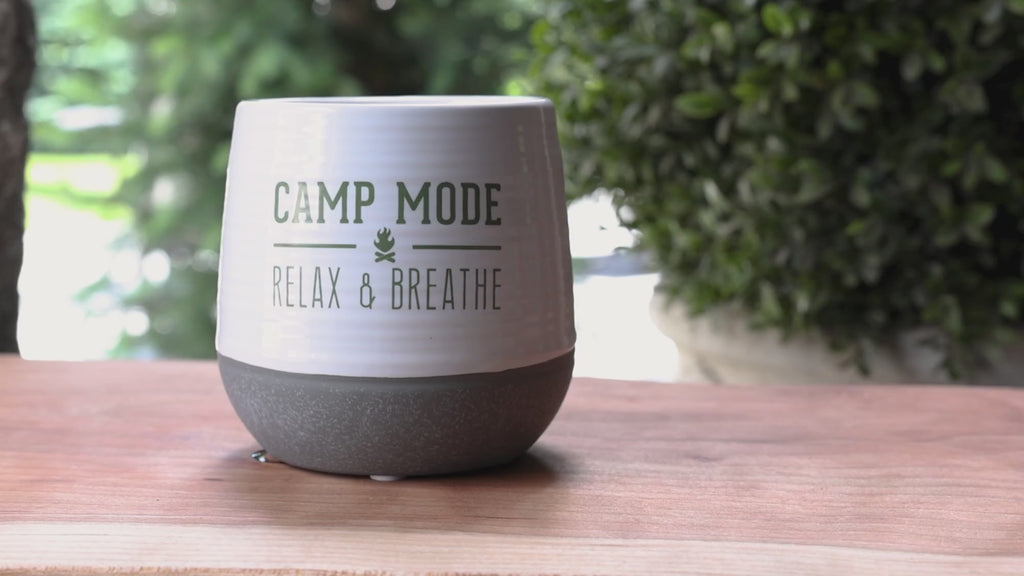 - IN-HOUSE DESIGN: The new & innovative candle offers a unique hidden special message within the wax as time progresses. The wax reveal begins to show after 10 minutes and is fully visible after 50 minutes of burn time. Overall burn time is 27-30 hours. The front side of the vessel features a green bonfire and a line design accompanied by a "Camp Mode. Relax & Breath" sentiment. The wax has a sizeable brown log and a yellow/red/orange campfire design.