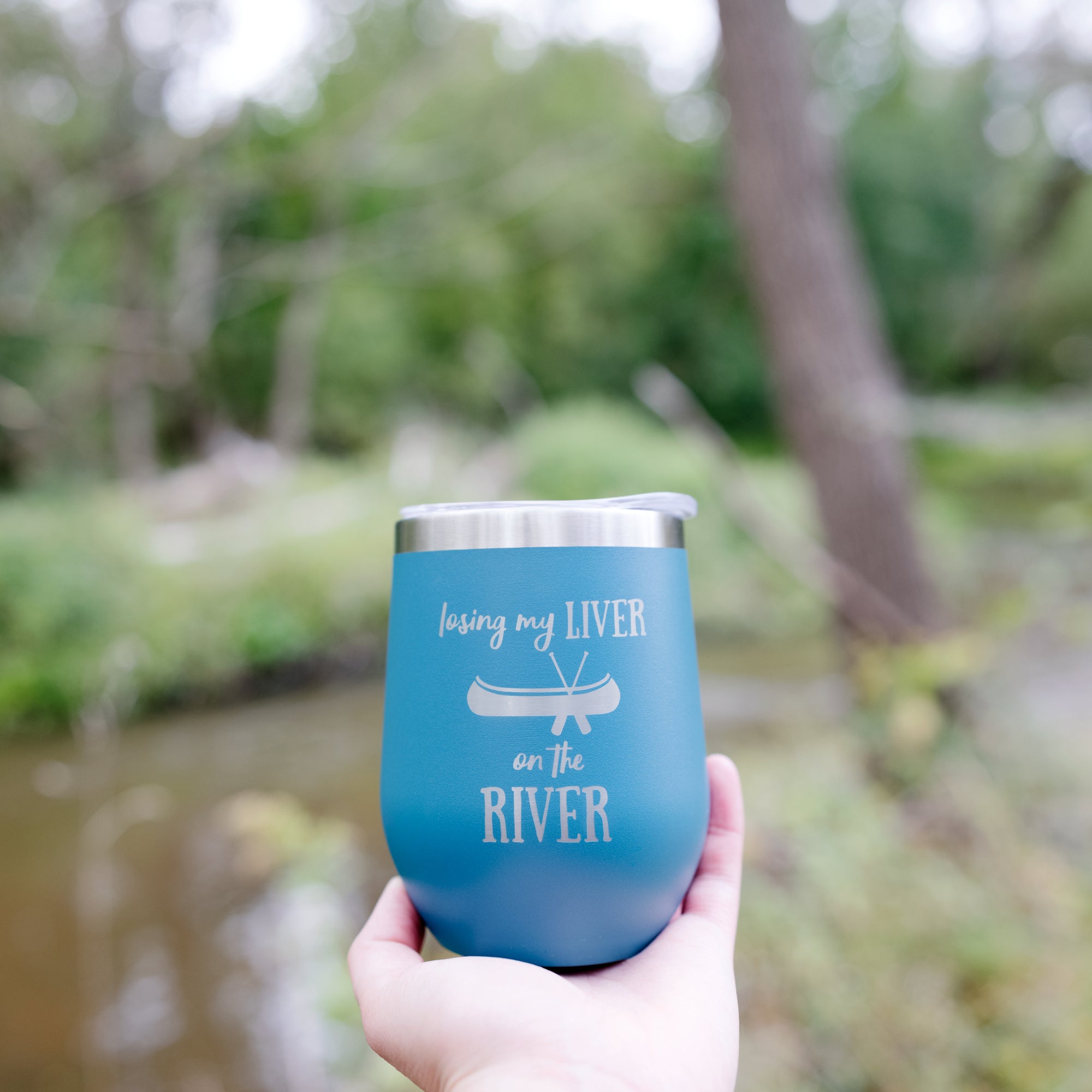 - IN-HOUSE DESIGN: The teal-green matte powder-coated body has an exposed stainless-steel lip and is debossed/engraved onto the front "Losing My Liver At The River" and canoe/oar design.