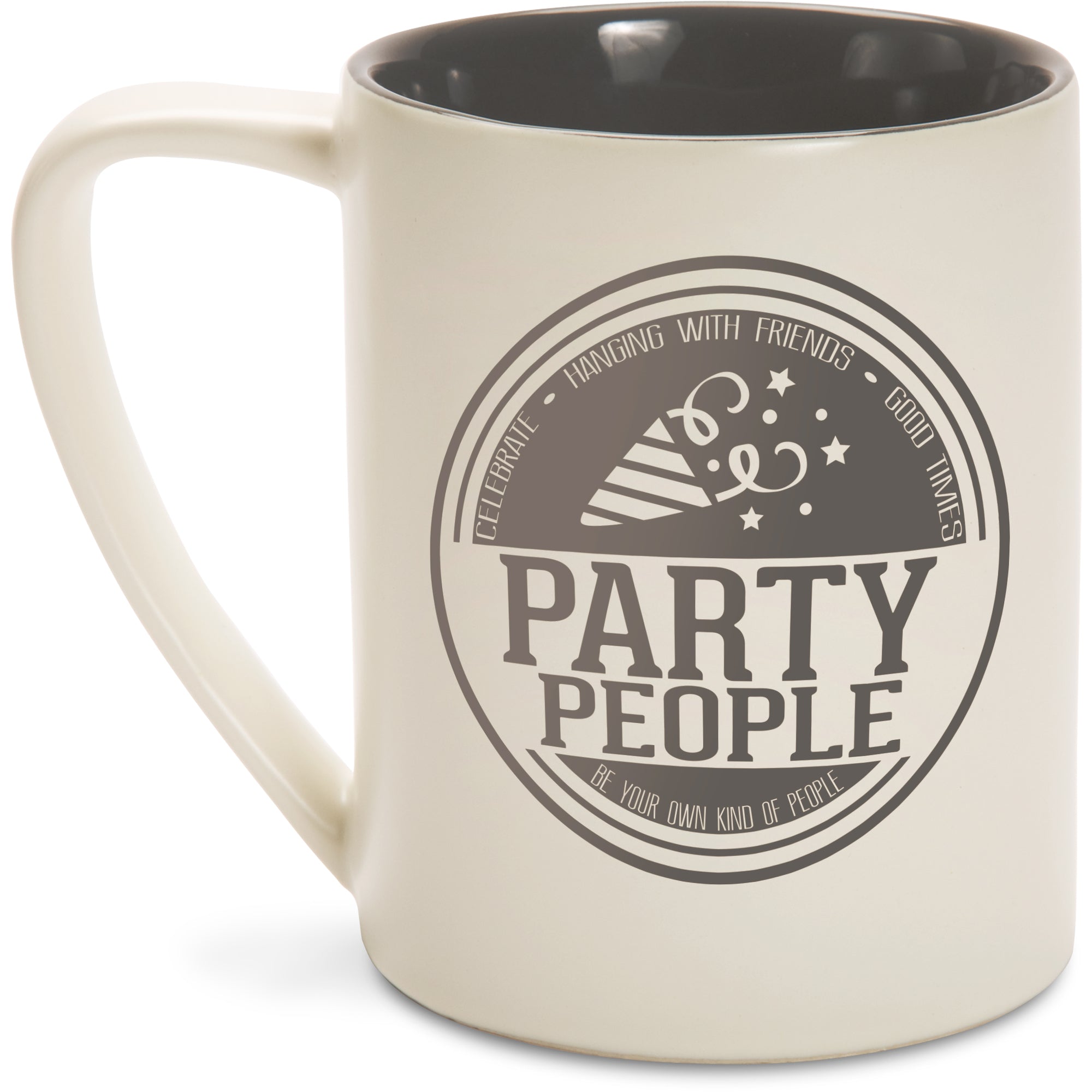 • IN-HOUSE DESIGN: "Party People" decal, including "Celebrate; Hanging With Friends; Good Times" text is printed on both sides of the mug, as are the accompanying blank logo and "Be Your Own Kind Of People" text.