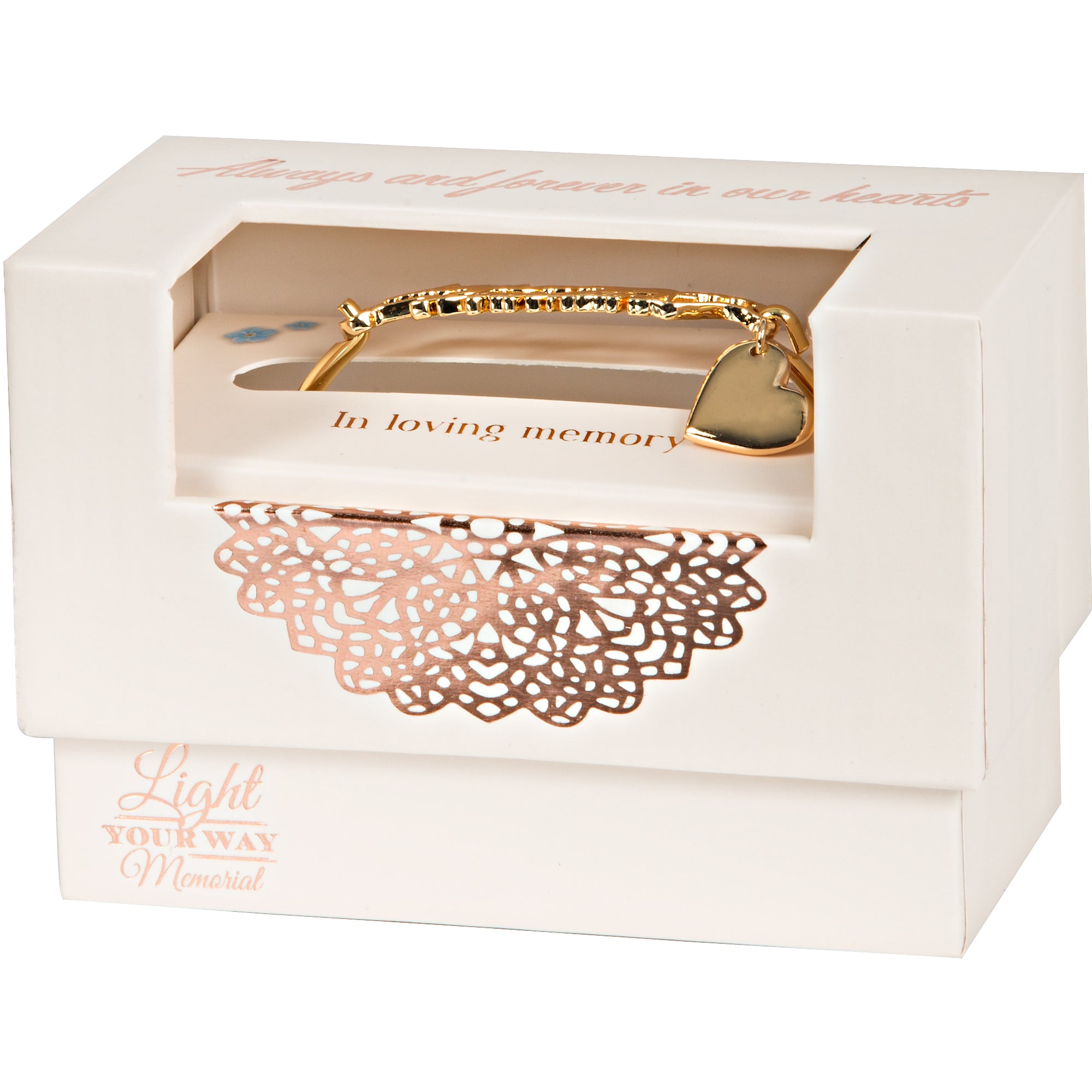 - IN-HOUSE DESIGN: "Always And Forever In Our Hearts" text is created with manipulation of metal and is accompanied by a hanging heart.