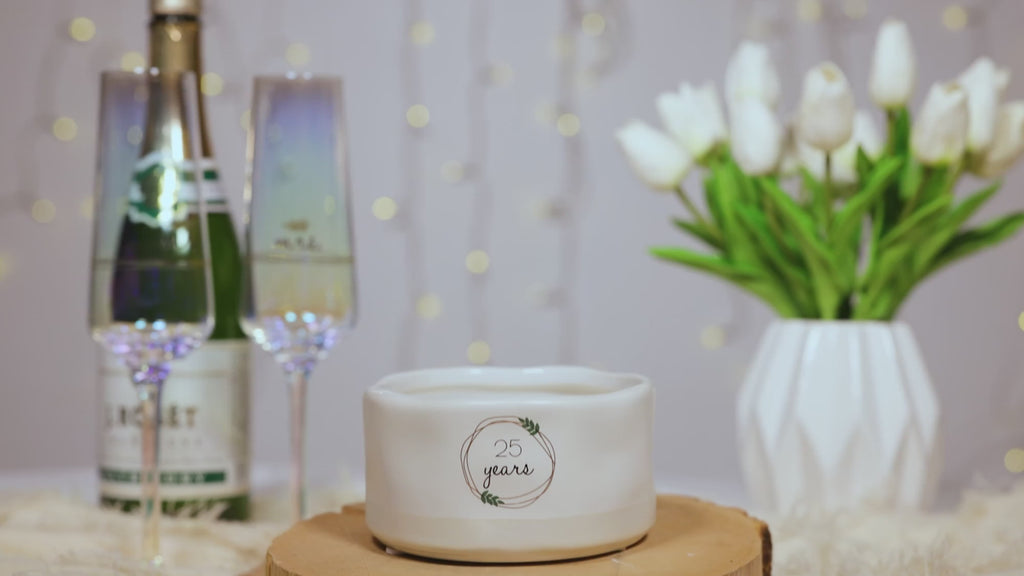 - IN-HOUSE DESIGN: The new & innovative candle offers a unique message for your loved one within the wax as time progresses. You will see cursive written "Let's Celebrate" sentiment after about 10 minutes. As you watch, the entire decal with an intertwining golden triple-string and polka dot design will appear after 60 minutes. Then, the message will hide again and reappear with each burn. The front of the candles has a simplistic "25 Years" decal accompanied by two leaves and a metallic gold triple intertwining circle on a matte white exterior handmade feel vessel with a glossy interior.