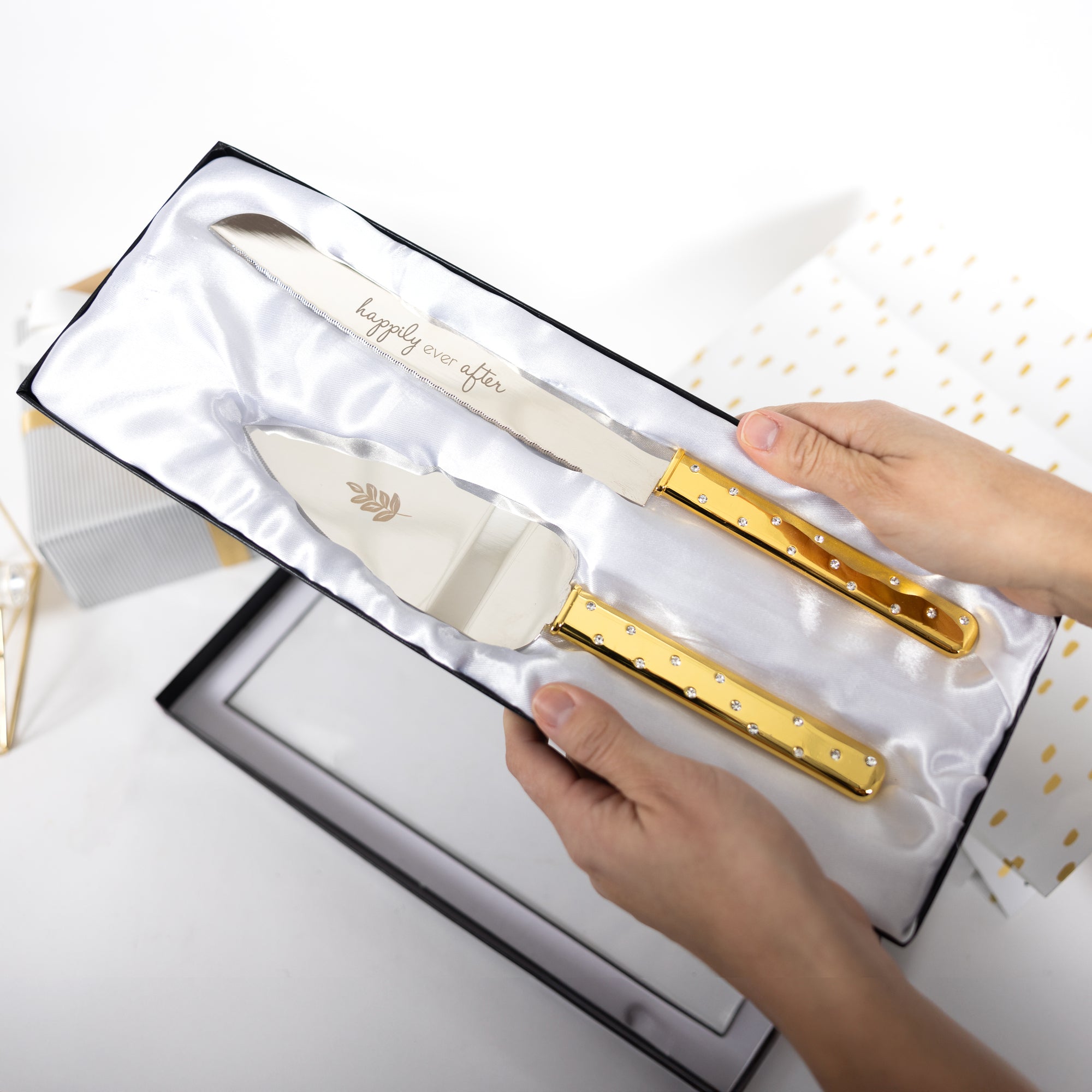 - IN-HOUSE DESIGN: The set’s gold handles and silver tops are meticulously designed with ridged edges. The cake server features a laser-engraved leaf design, and the knife is adorned with the laser-engraved phrase “happily ever after” in the silver area. These details create a sophisticated and personal touch perfect for special occasions.