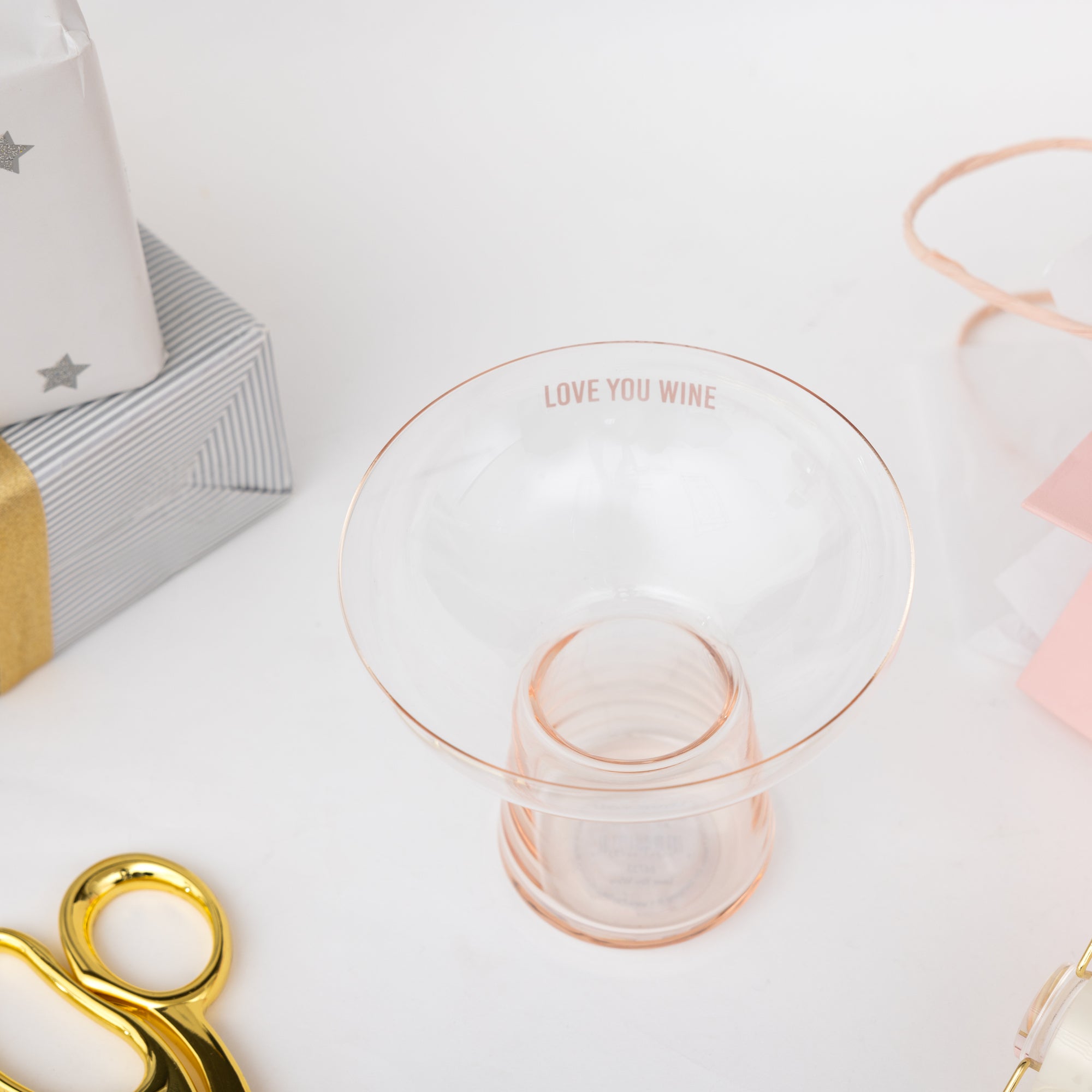 - IN-HOUSE DESIGN: The glass is clear at the top and becomes see-through pink through an ombre fade at the bottom. The sentiment "Love You Wine" is printed on the exterior edge of the back of the brim.
