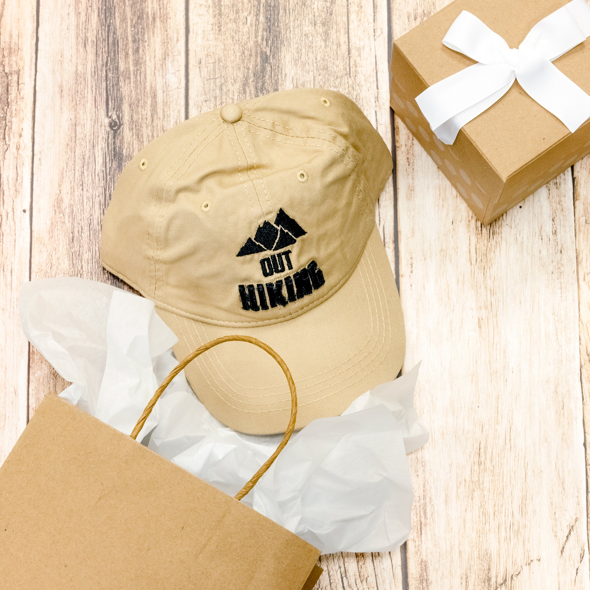 - IN-HOUSE DESIGN: The interior brim is lined with a matching flannel plaid pattern. "Out Hiking" sentiment embroidered and appliqued onto the front of the earthy beige hat, which features a black mountain range design. Packaged in a plastic polybag with hangtag.
