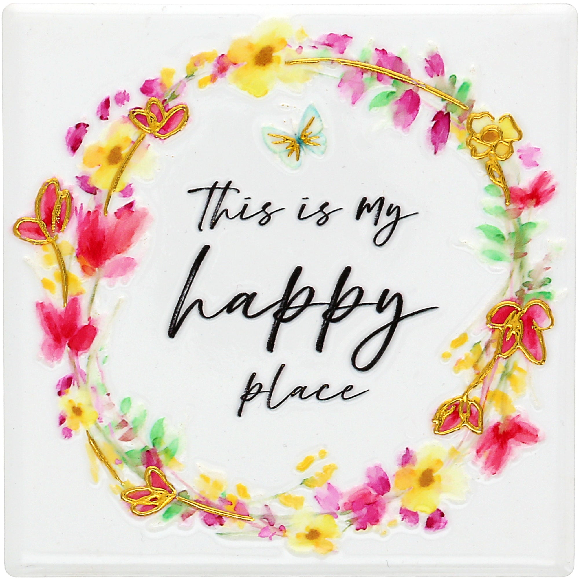 • PREMIUM QUALITY: Made from ceramic with a glossy, raised finish and gold accent text, this 4" x 4" coaster features a cheerful wreath of colorful florals surrounding the words “This is my happy place.” The cork backing adds stability and protection against scratches and spills.
