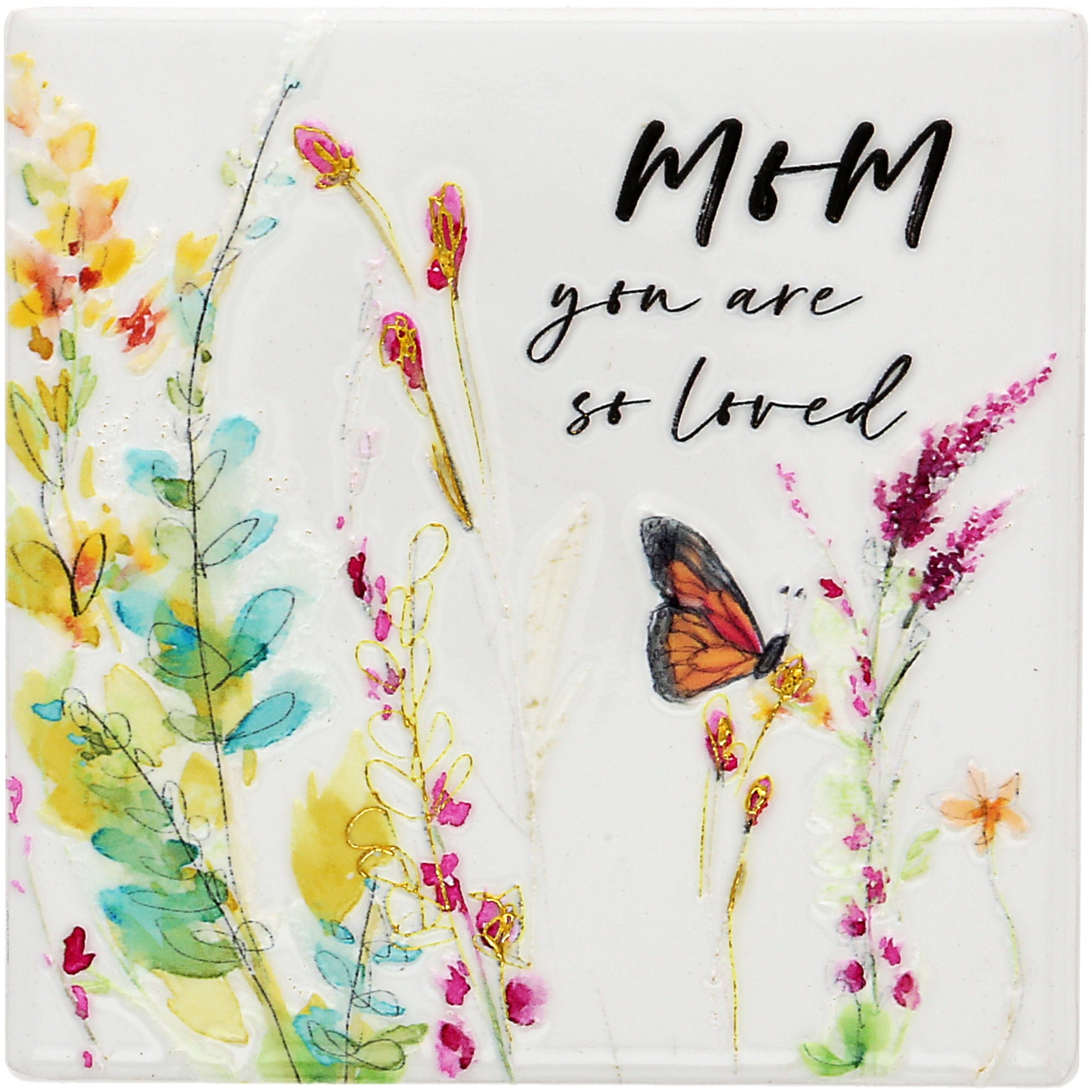 - PREMIUM QUALITY: This 4" x 4" ceramic coaster features a smooth glossy finish with raised gold-accent text and a natural cork backing for surface protection. The design includes vibrant botanical artwork with butterflies and wildflowers, complemented by the sentiment “Mom, you are so loved.” Both functional and heartfelt, it’s packaged in a white die-cut box for easy gifting.