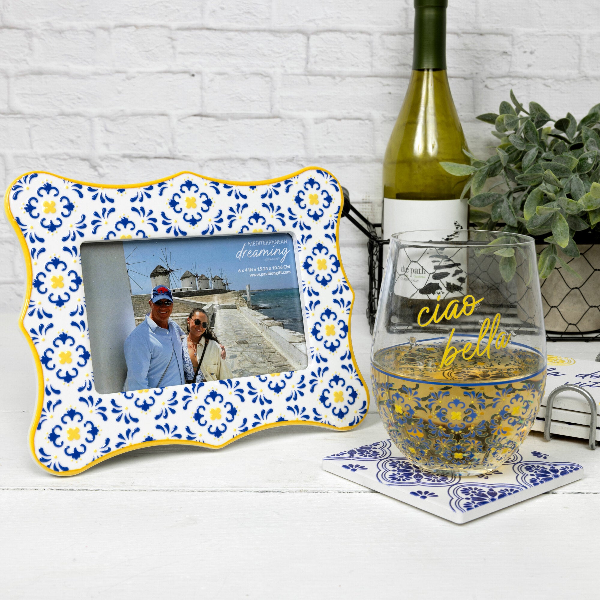 - PREMIUM QUALITY: Crafted from durable stoneware, this 8.25" x 6.5" picture frame holds a standard 6" x 4" photo and features a self-standing easel back for easy tabletop display. The glossy ceramic surface showcases 3D embossed decal artwork in a stunning blue and yellow tile-inspired pattern reminiscent of Mediterranean design. Each frame is packaged in a protective white die-cut box for secure storage or gifting.
