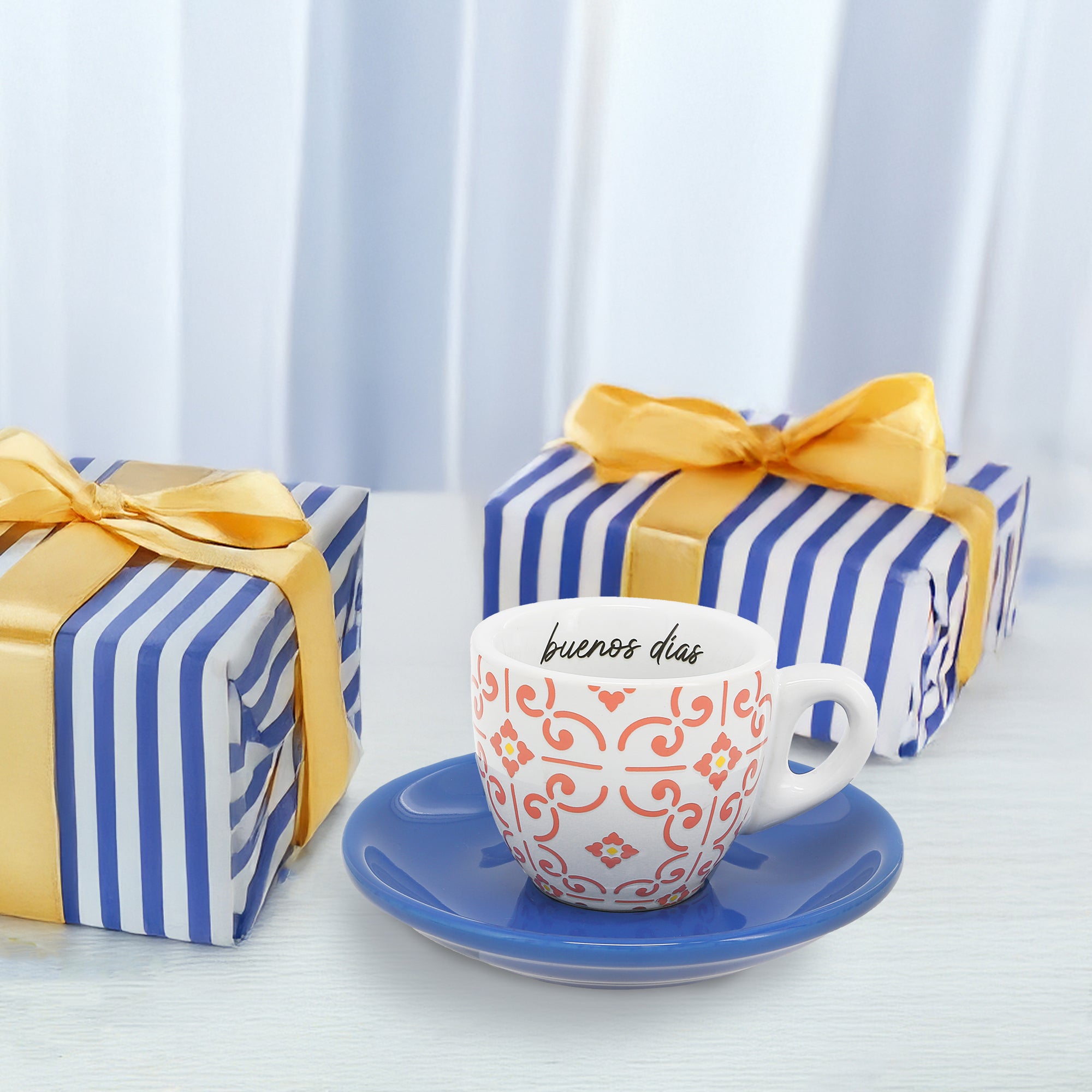 - IN-HOUSE DESIGN: Inspired by traditional Mediterrean tiles, this design features an intricate red and coral pattern on the cup, paired with a bold blue saucer. The phrase "Buenos Días" (Good morning) is elegantly printed inside the rim, offering a bright and cheerful start to the day.