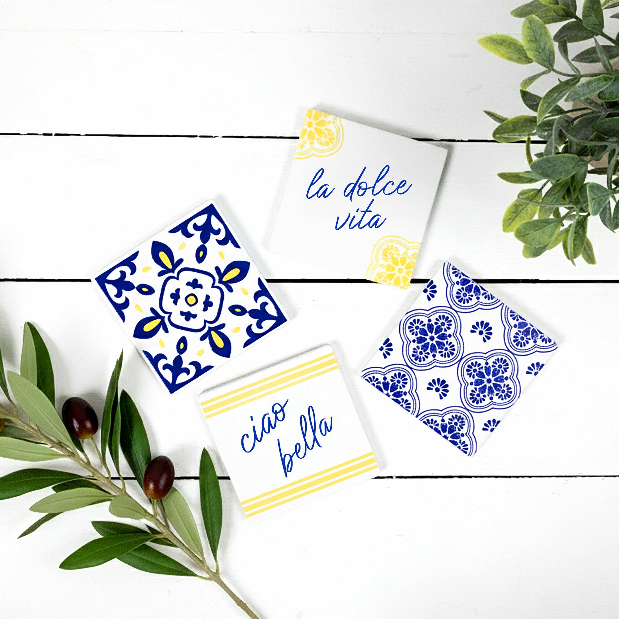 - IN-HOUSE DESIGN: Includes four Mediterranean-inspired designs: classic tile patterns in vibrant blue and yellow, and two Italian phrases—“Ciao Bella” and “La Dolce Vita”—evoking the beauty of coastal life and sunny escapes.