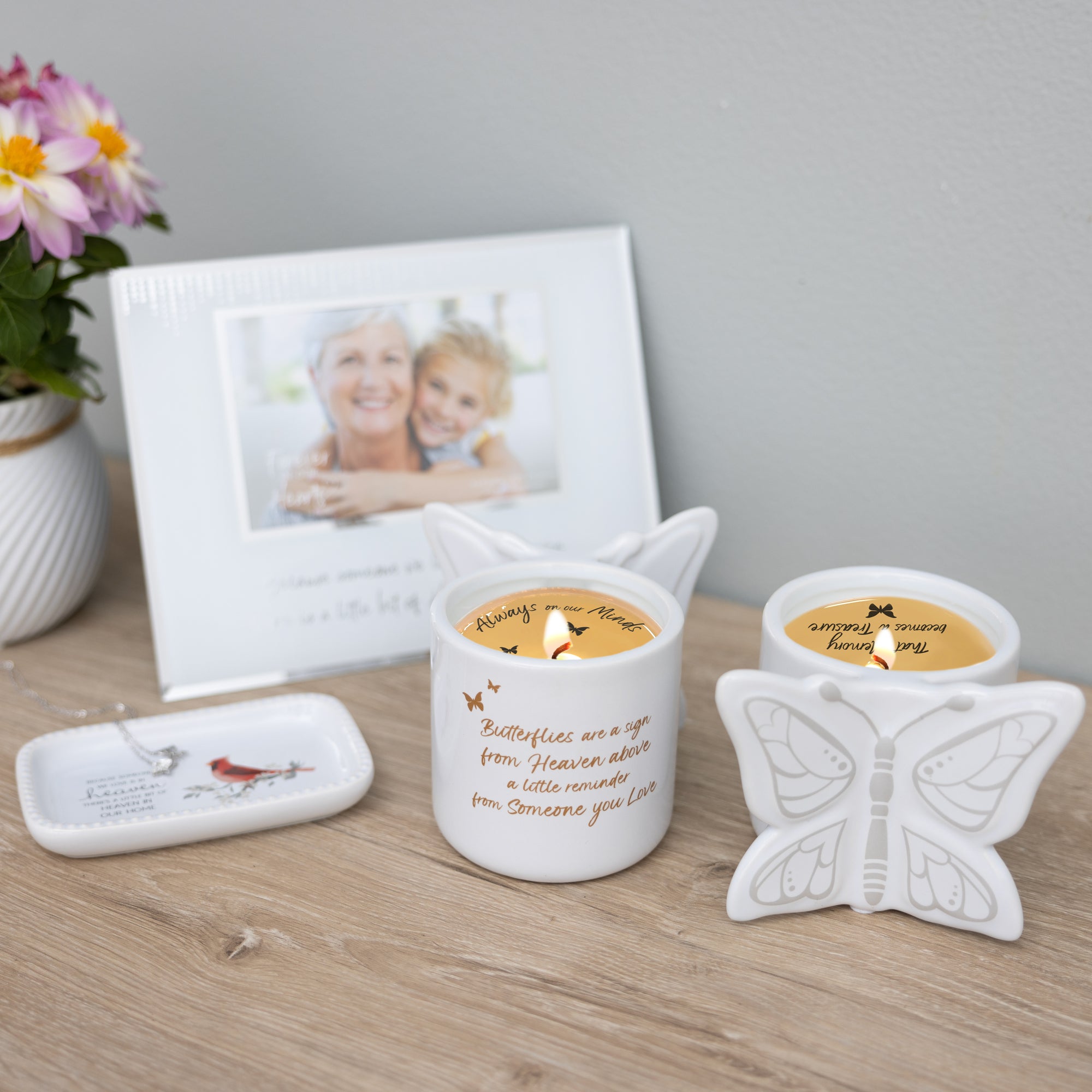 - IN-HOUSE DESIGN: Glass front has electroplated silver around the rim of the photo and the edge of the frame. The white paper center has a polka dot design and is accompanied by a silver "Because Someone We Love Is In Heaven, There Is A Little Bit Of Heaven In Our Home" sentiment. The backing is made from thick cardboard-like material with a metal hinged easel for displaying and 2 metal tabs for photo replacement. Turn the tabs and fold the insert backing to the right to replace the photo.