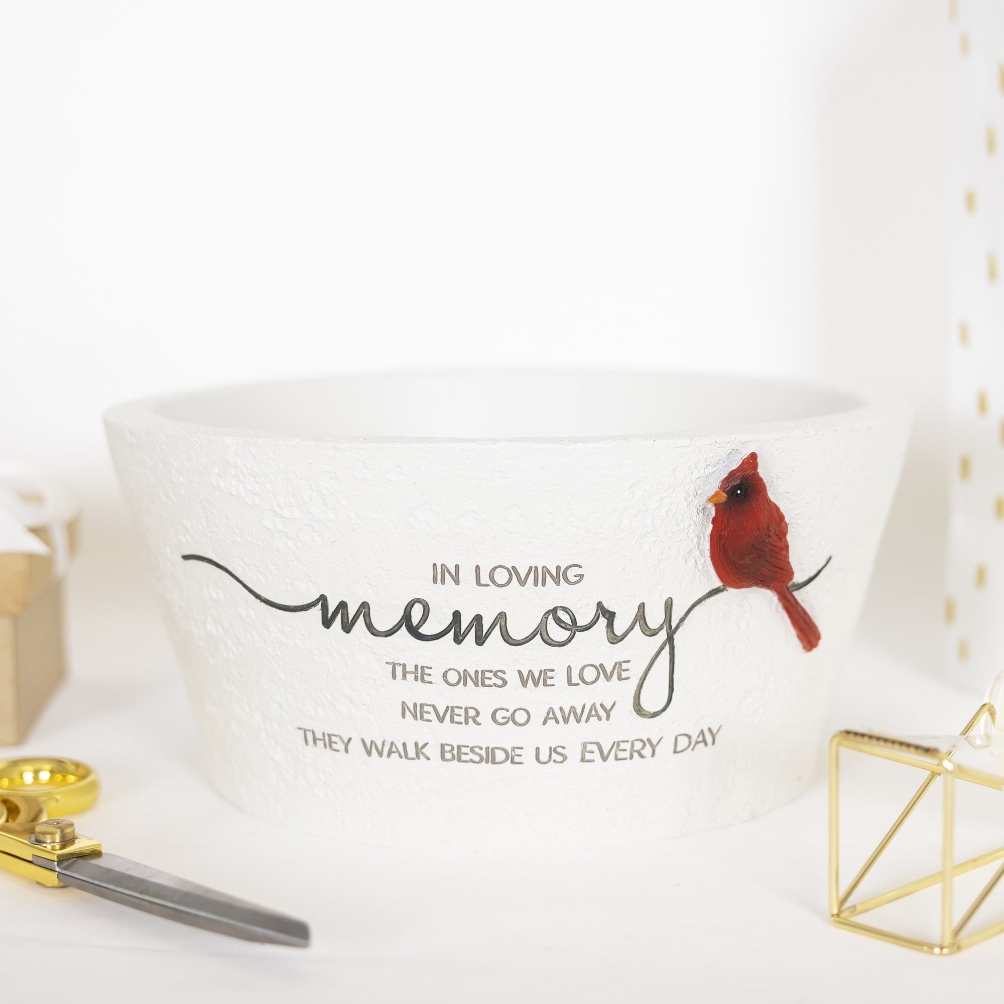 • IN-HOUSE DESIGN: The frontside of our 9.5" long and 4.5" tall resin memorial planter features a heartfelt sentiment debossed in dark gray: "In Loving Memory: The Ones We Love Never Go Away They Walk Beside Us Every Day." Adding a touch of symbolism and beauty, a beautiful handpainted red cardinal is embossed on the branch of the "y", with intricate details and shadowing. The cardinal is often seen as a spiritual messenger, symbolizing a connection to loved ones in heaven, making this planter a meaningful and comforting tribute.