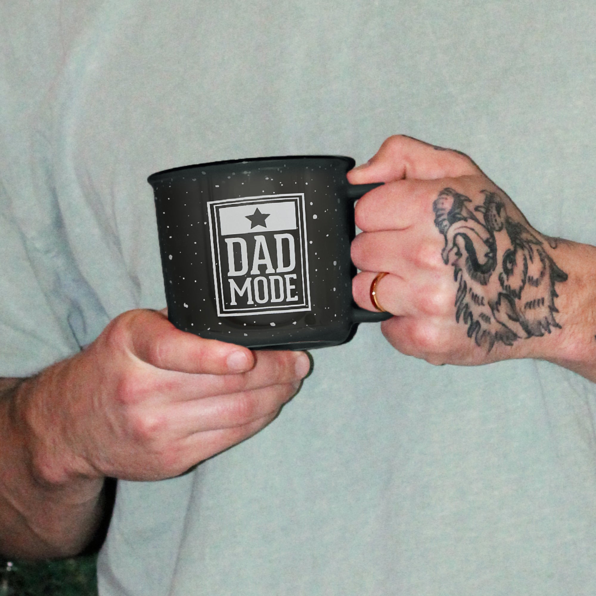 - IN-HOUSE DESIGN: The dark gray body has a white dotted and black lip exterior. One side has a large white star in the center, whereas the other has a vertical rectangular outlined design with "Dad Mode" and a smaller gray star. The wrap-around interior design has tiny gray staggered stars that reach from the top to the bottom of the interior walls. The overall finish is glossy on the interior and exterior.