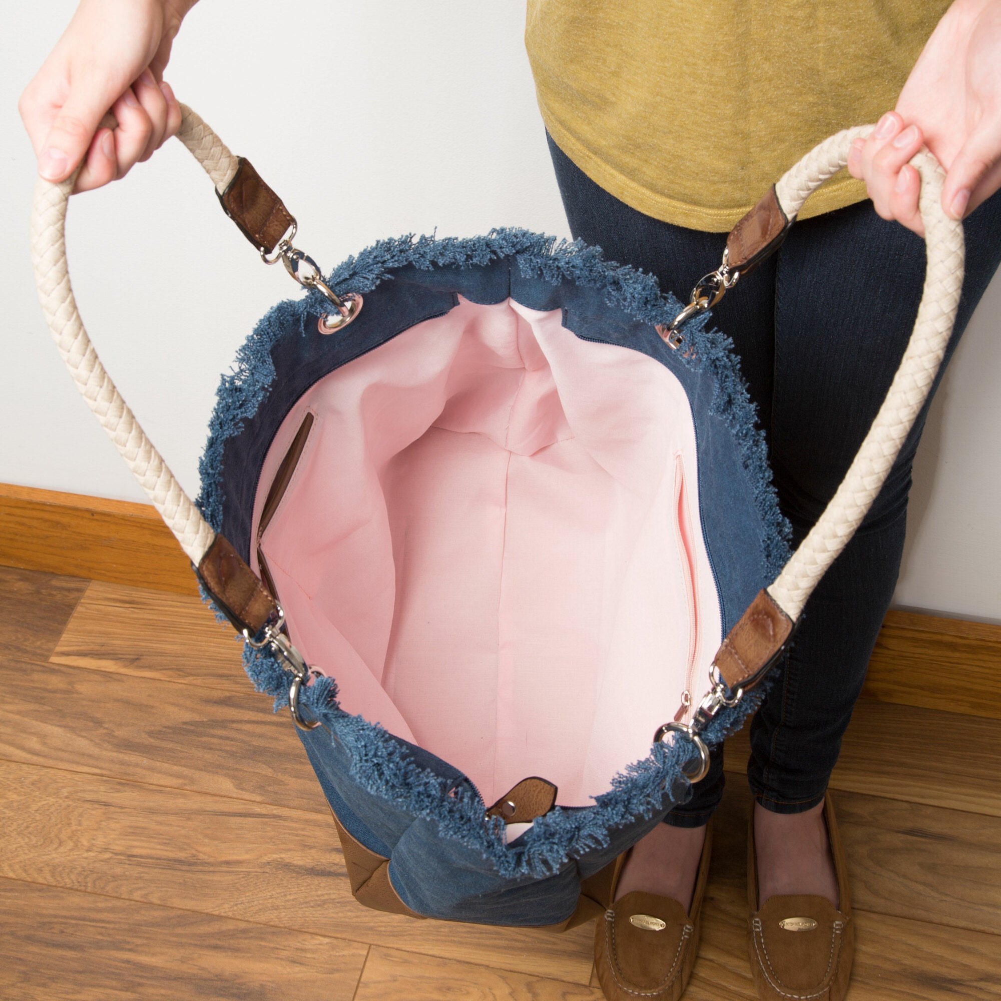 - BAG DETAILS: Interior of the bag features three pockets: two open and one zipper.