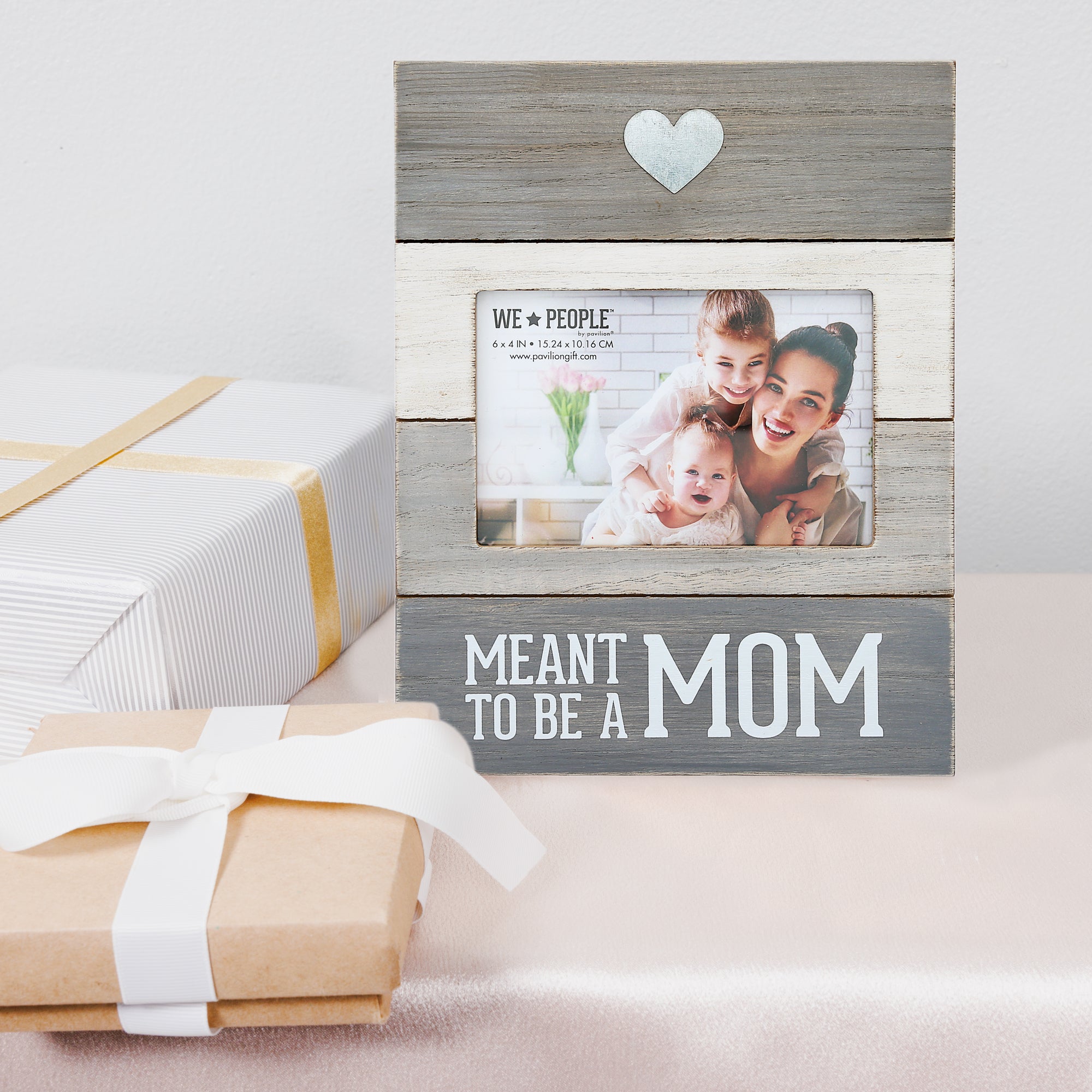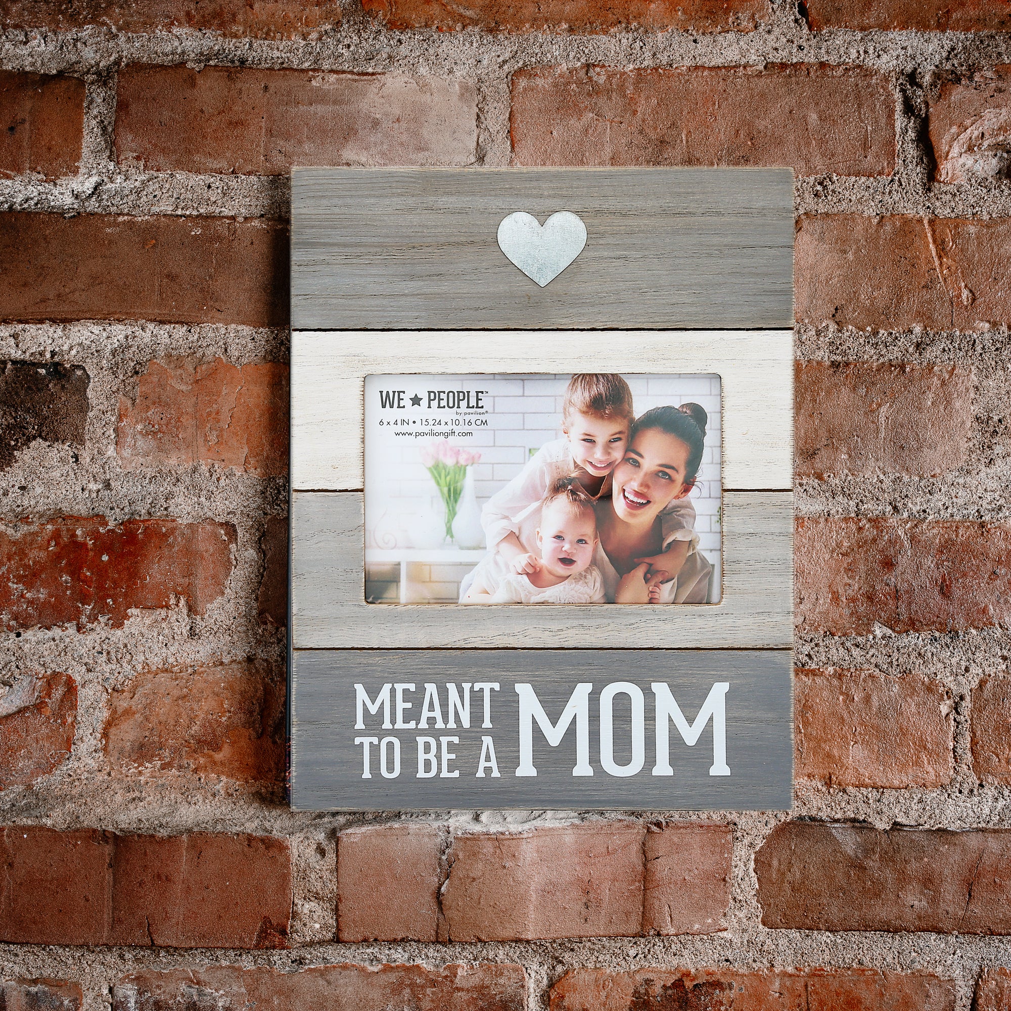 - IN-HOUSE DESIGN: The heart in the top section of the frame is metal and the panel is dark gray. The second section is a cream color and holds the top half of the photograph. The third section is a beige color and keeps the bottom half of the picture. Finally, the bottom gray area has a white "Meant To Be A Mom" screen-printed sentiment. The overall look of the frame is rustic, modern, and whitewashed.