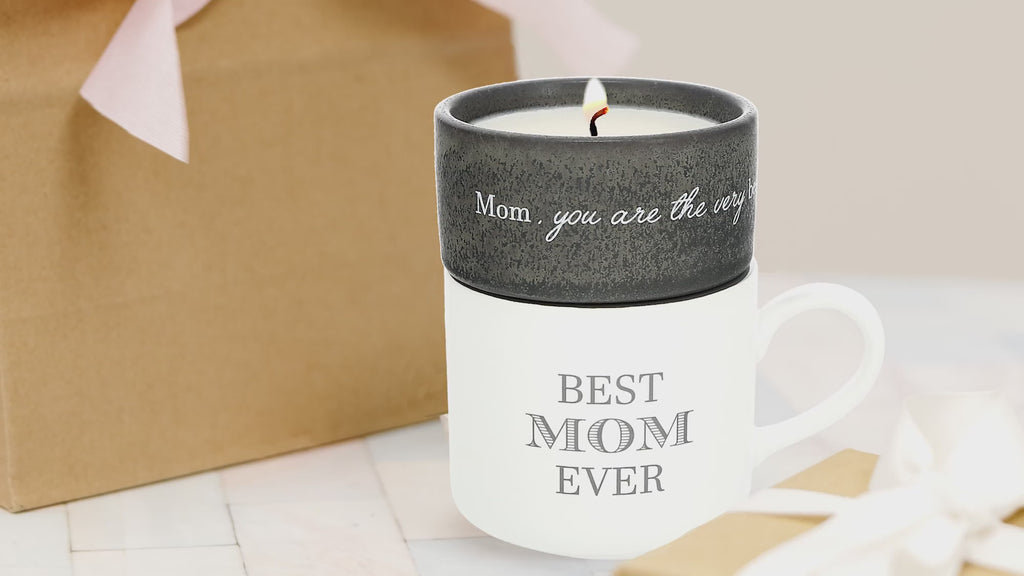 - IN-HOUSE DESIGN: Wrap-around white sentiment on the candle, "Mom, You Are The Very Best And Loved The Most." Gray mug sentiment "Best Mom Ever" on the front side of the mug only. Faces towards you in the right hand or outward in the left hand.