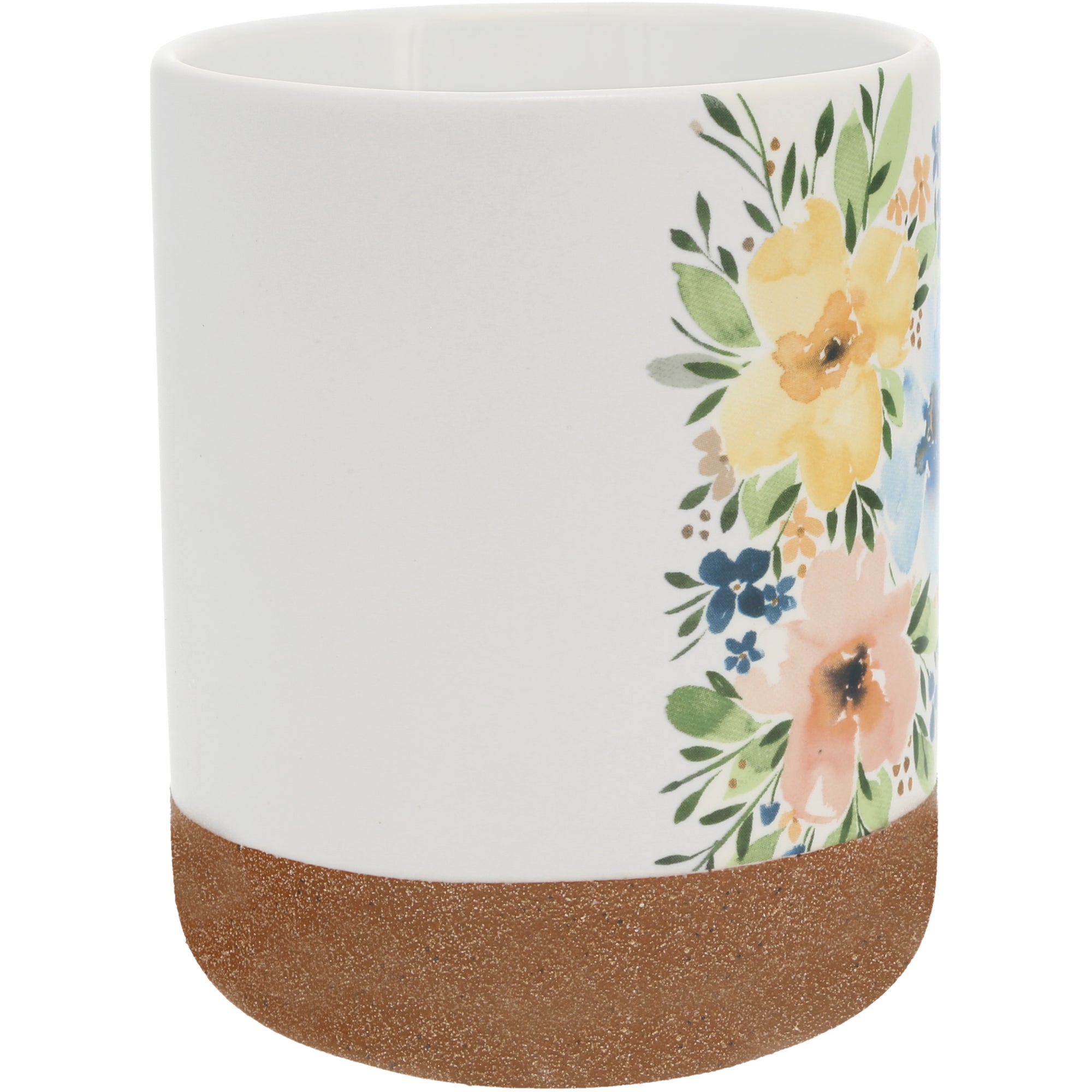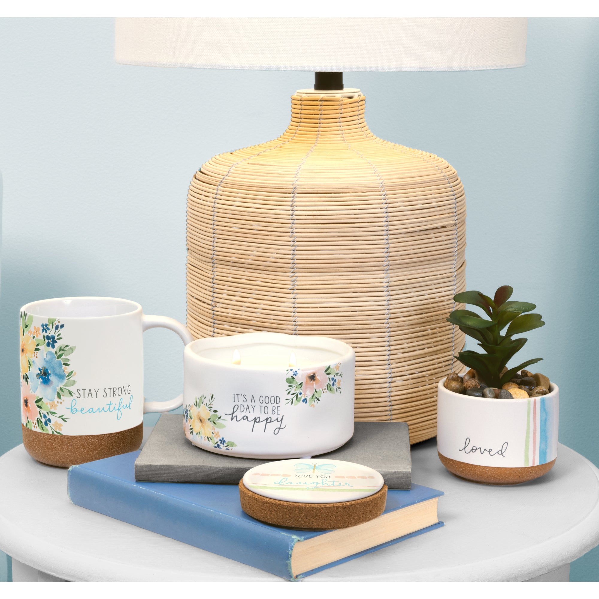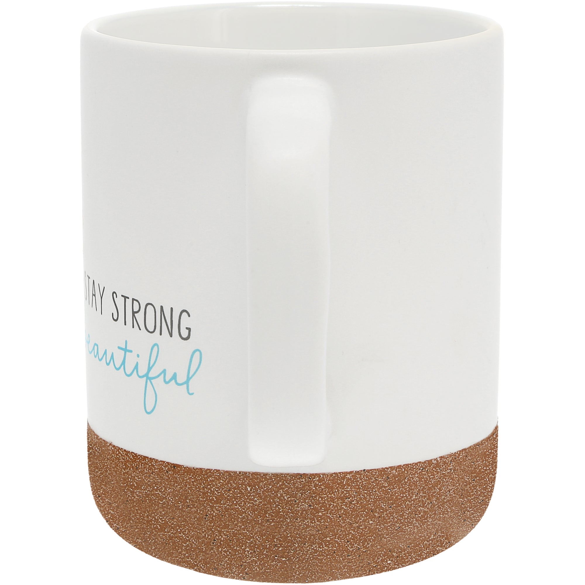 - IN-HOUSE DESIGN: The coffee cup features a glossy watercolor design encompassing a simple wrap-around blue and peach floral design accompanied by a "Stay Strong Beautiful" blue & gray sentiment on the front. Illustrations created by artist Blue Chair Blessing.