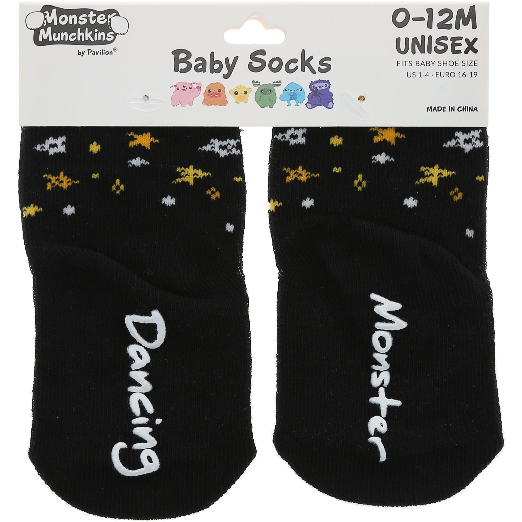 - IN-HOUSE DESIGN: The hand-drawn yellow and white stars cover the ankle section of the sock. The large yellow fuzzy-head monster threw his hands in the air on the top of the foot. One sock has "Dancing" while the other has "Monster" in white on the bottom.
