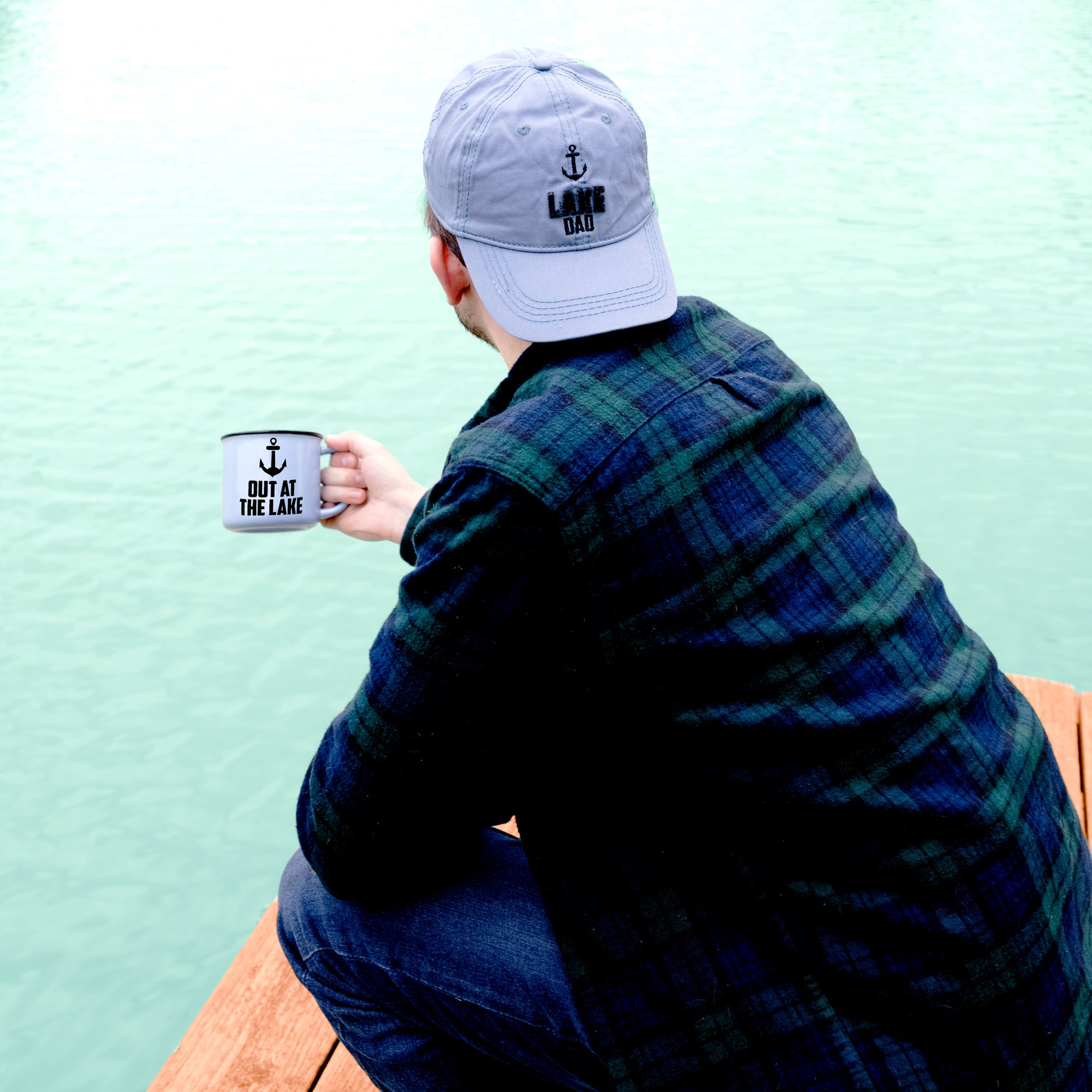 - IN-HOUSE DESIGN: The water blue coffee cup features an "Out At The Lake" one-sided design accompanied by an interior plaid wrap-around pattern and an anchor decal.