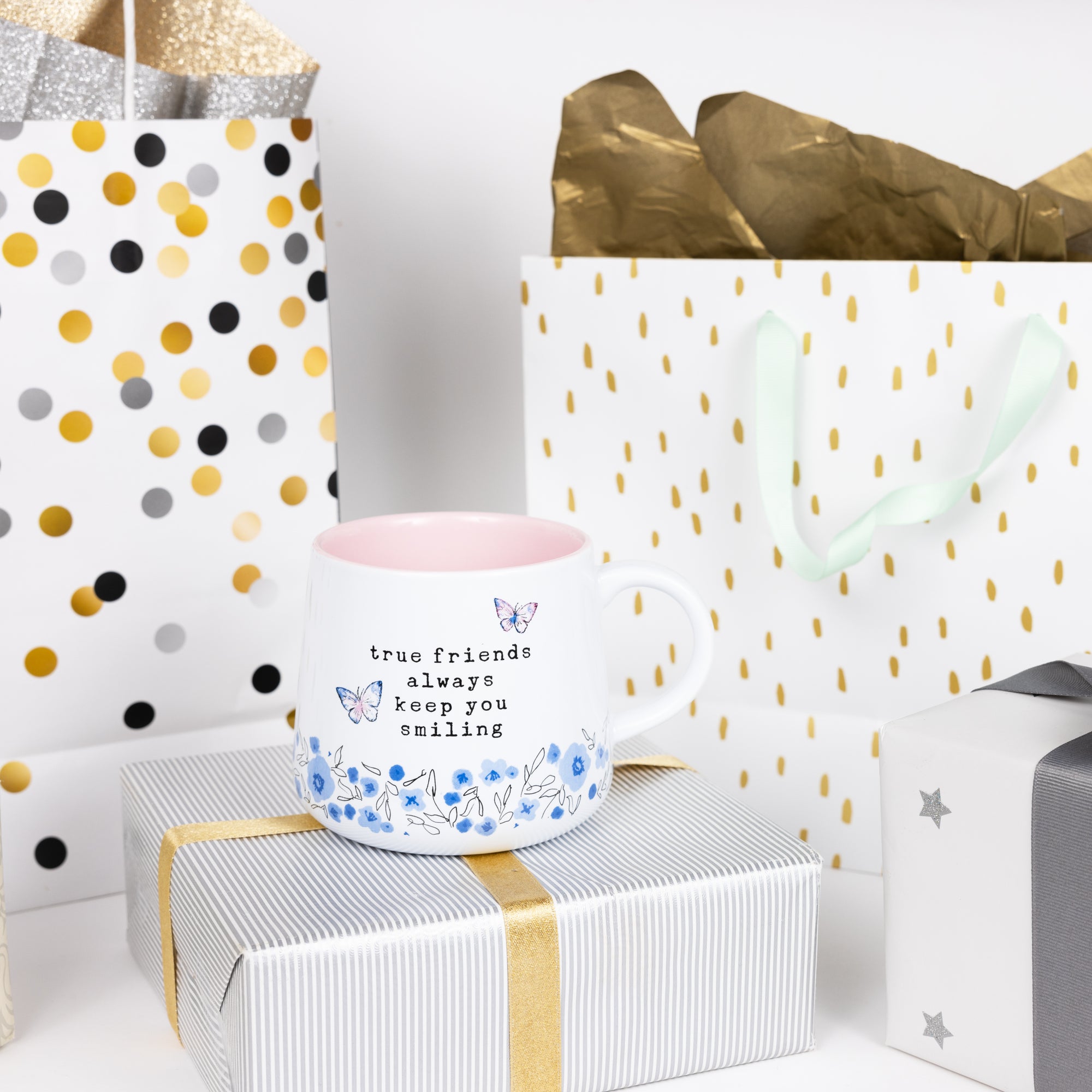 - IN-HOUSE DESIGN: You will see a typewriter with a "True Friends Always Keep You Smiling" sentiment is placed in the top center of the mug. A pink glossy interior smooth-edged vessel with a glossy exterior with walls that features a blue floral design that wraps around the outside bottom third of the cup. Two beautiful butterflies flutter next to the sentiment.
