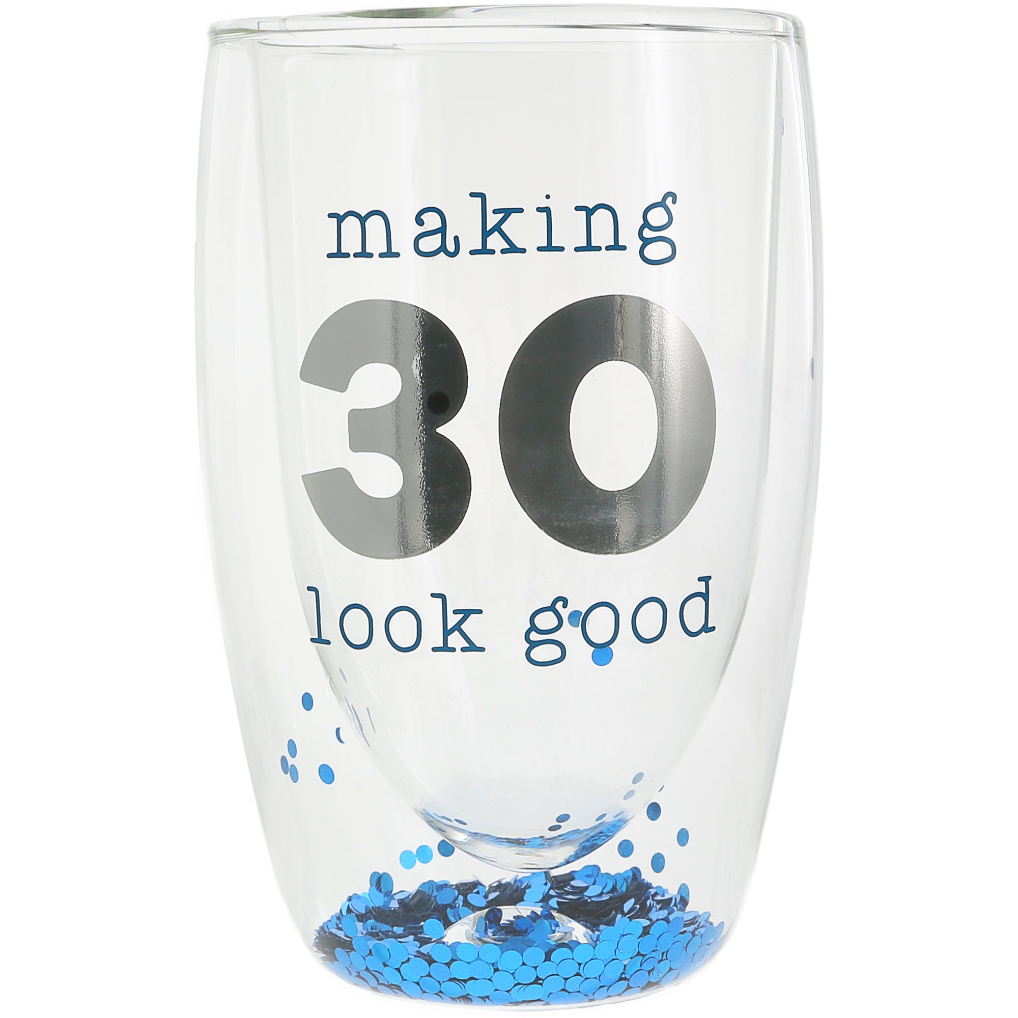 - IN-HOUSE DESIGN: The front of the glass has a blue and metallic silver sentiment, "Making 30 Look Good." The round confetti is blue and iridescent.