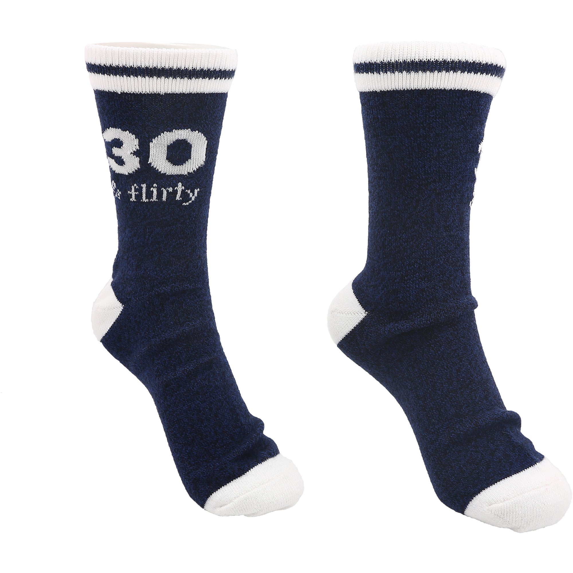 - IN-HOUSE DESIGN: The crew socks have a cream ankle, toe & heel with a navy blue body, and a cream "30 & Flirty" celebratory sentiment is right at the ankle below the striped top. This design reflects on the exterior of each hose.