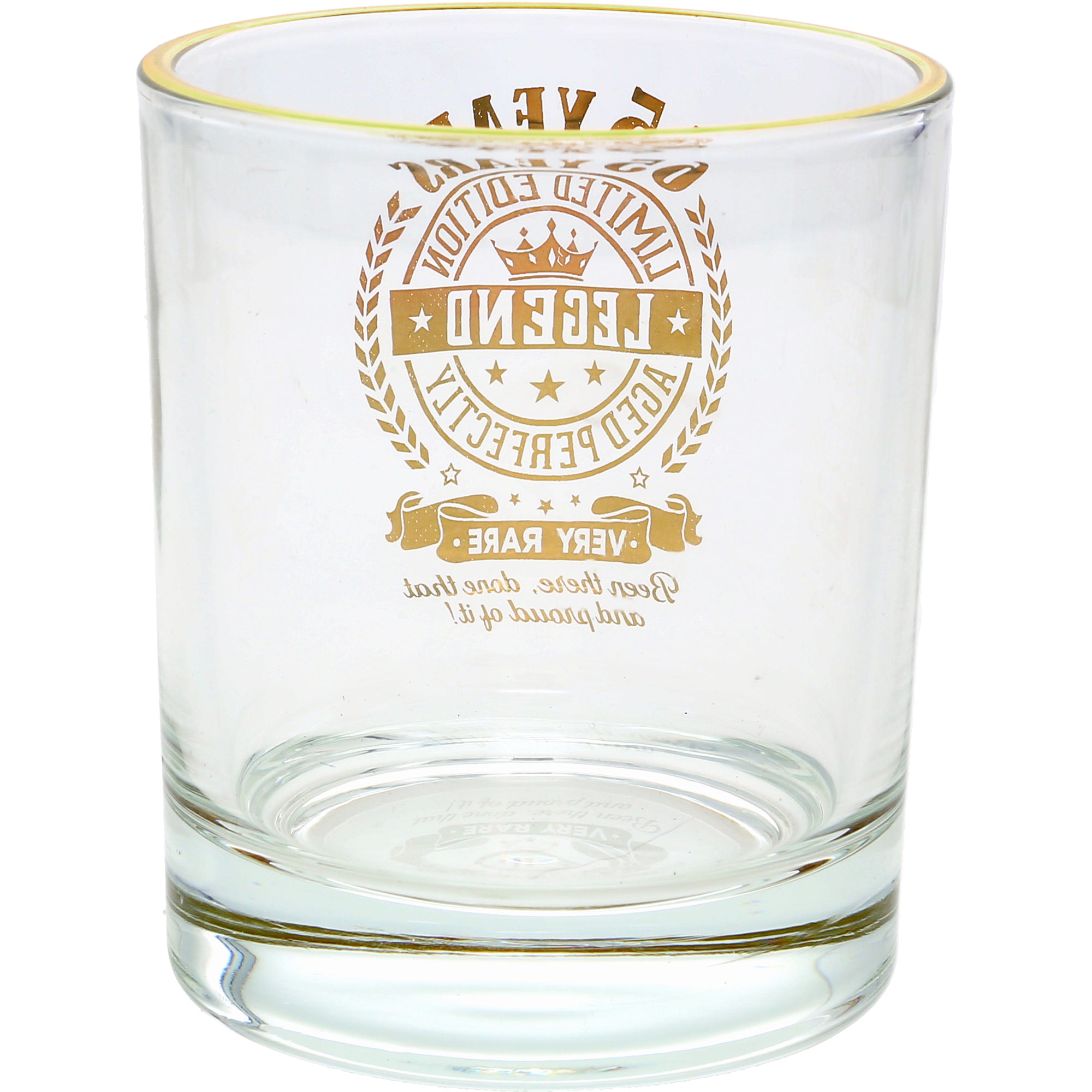 - IN-HOUSE DESIGN: The gold electroplated rim is accompanied by the gold "65 Years Limited Edition Legend Aged Perfectly Very Rare Been There, Done That And Proud Of It!" sentiment decal on the front side of the whiskey along with banners and stars. Glassware with a refined, aesthetically pleasing look.