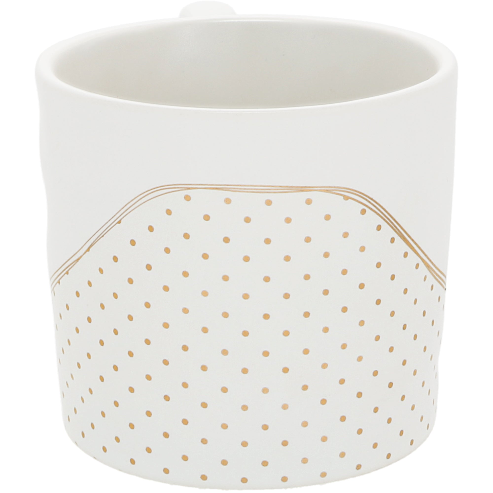 - IN-HOUSE DESIGN: The coffee cup features an iridescent white pearl sparkle glaze interior with a wrap-around striped, polka dot gold design exterior, and green rowan leaf, accompanied by a "Happily Engaged" black sentiment.