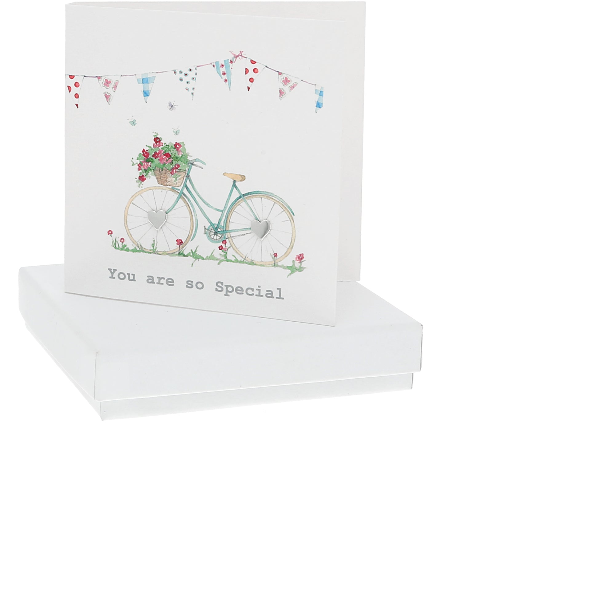 • IN-HOUSE DESIGN: The cheerful, celebratory printed watercolored basket full of florals with fluttering butterflies and a string of flags, teal and tan vintage bicycle with the earrings strategically placed within the center of the design of the wheels. The typewritten gray "You Are So Special" sentiment is placed below the graphic.