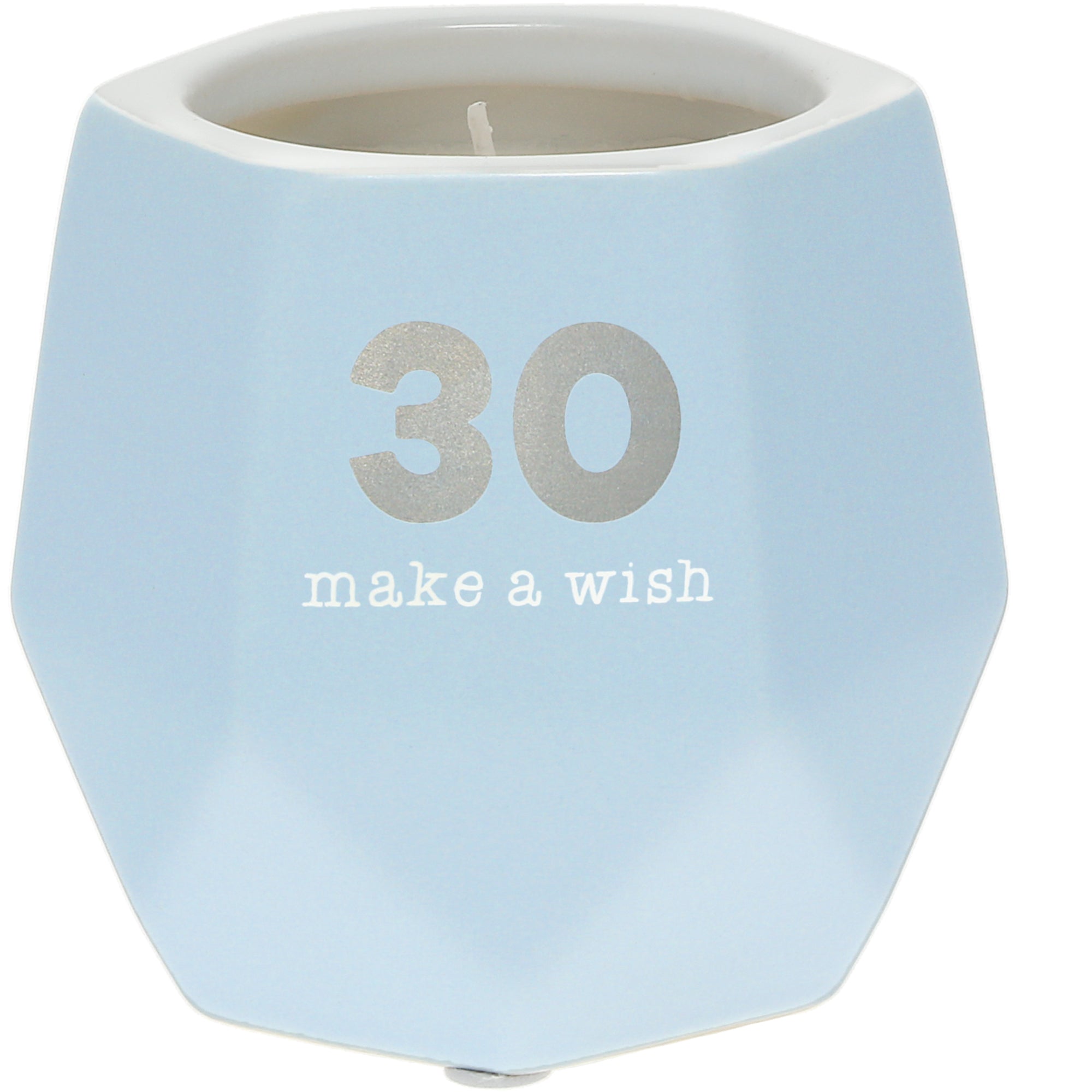 - IN-HOUSE DESIGN: Silver metallic & glossy white "30 Make A Wish" sentiment lines the front center of the geometric candle, which has a six-sided hexagon on the upper two-thirds and a twelve-sided one-third bottom. Always remember to trim your wick down after each burn and burn your candle to the outside for continual even burn.