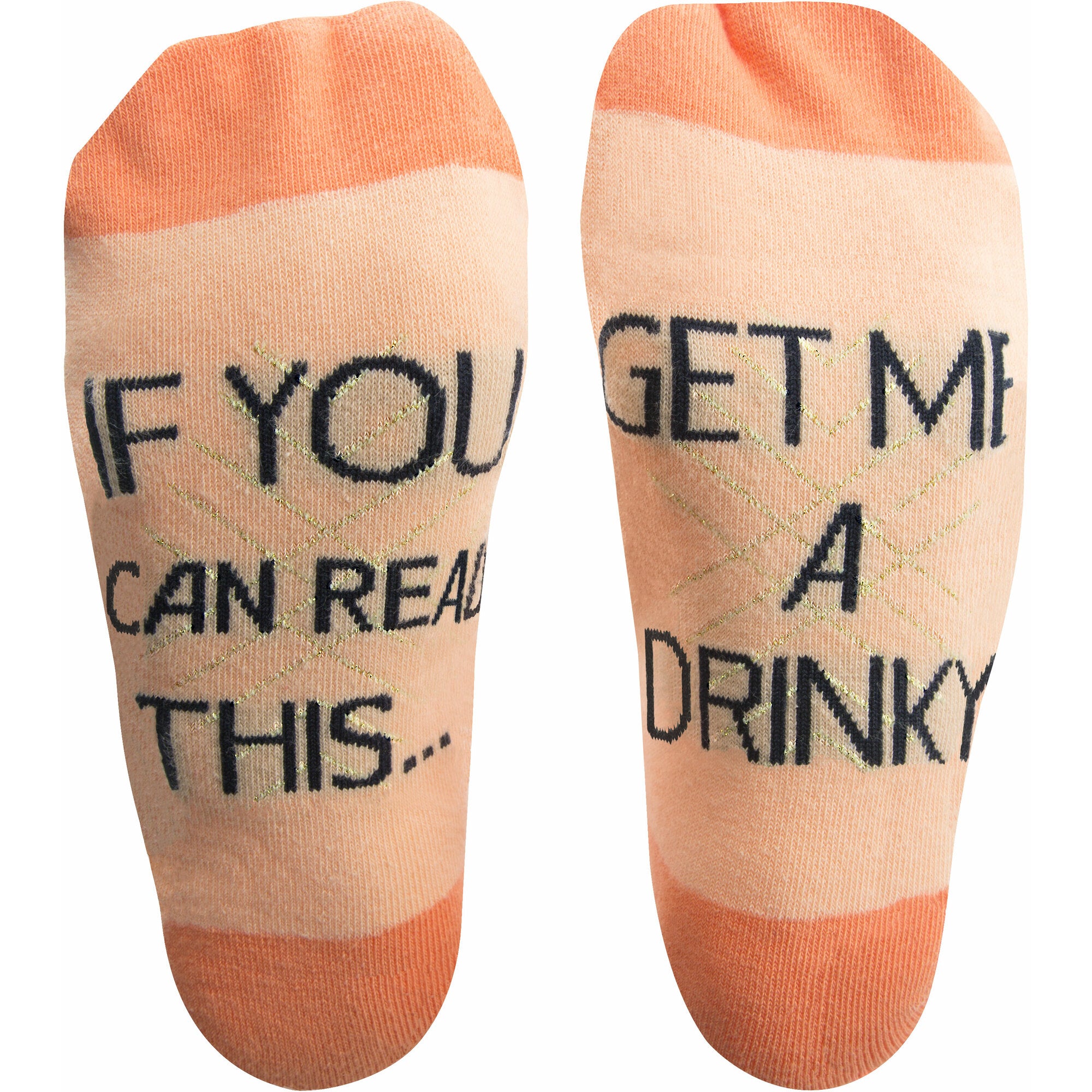 - IN-HOUSE DESIGN: "If You Can Read This... Get Me A Drinky" text is sewn into the base of the socks and is accompanied by a geometric icon on the side of each sock.