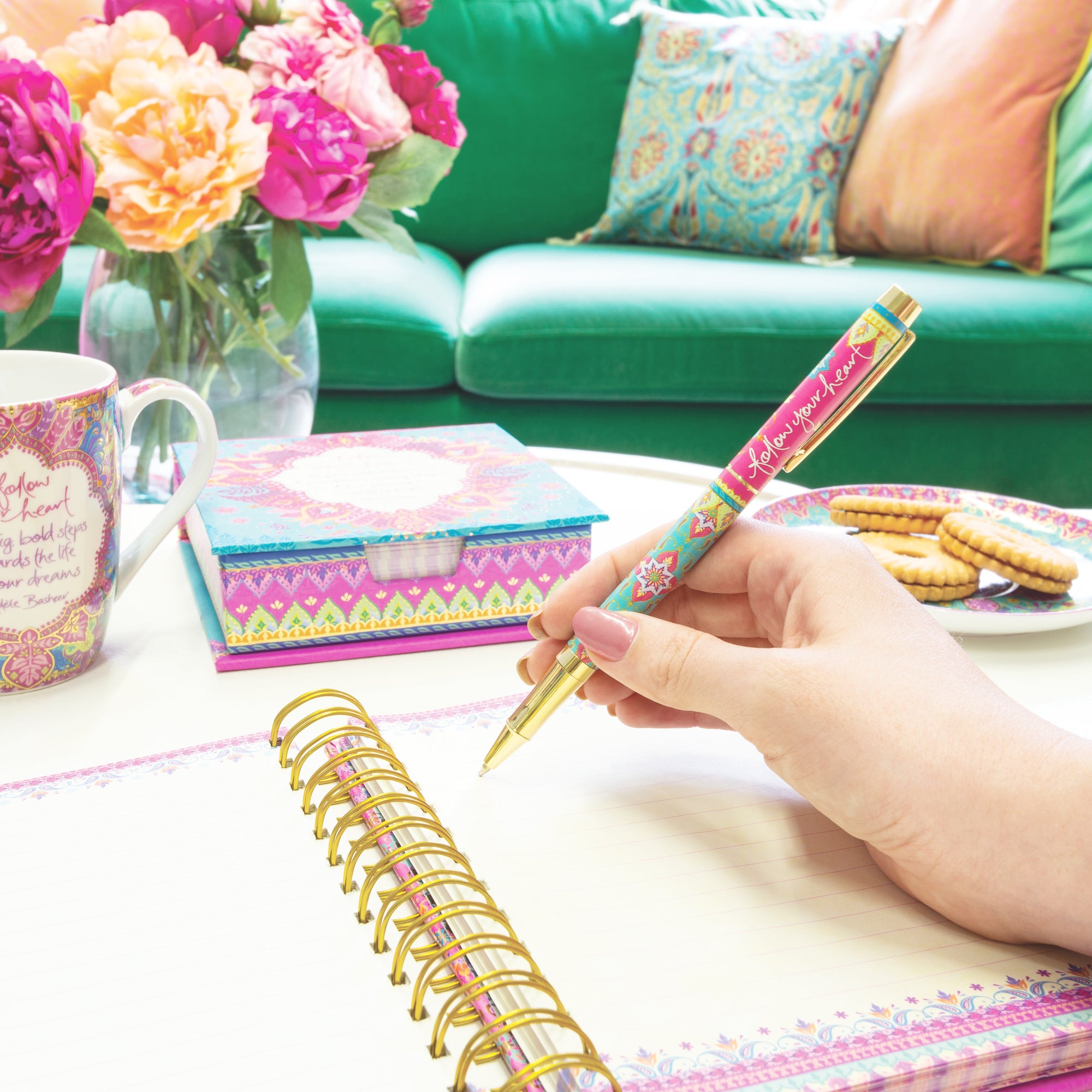 • IN-HOUSE DESIGN: "Follow Your Heart" text and accompanying boho design are printed onto the pen and gift box.