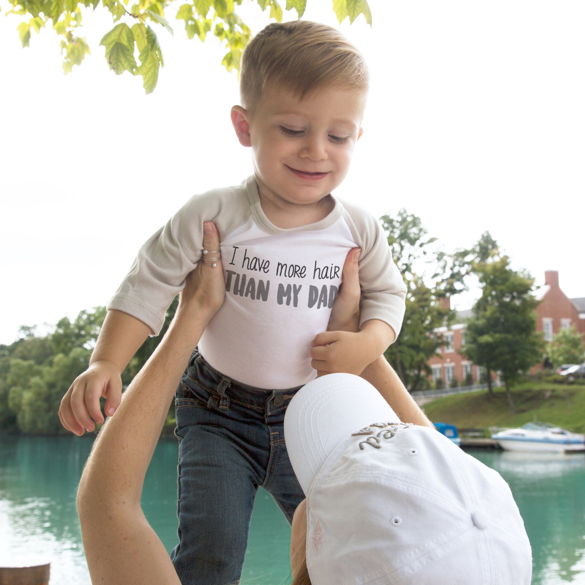 - IN-HOUSE DESIGN: "I Have More Hair Than My Dad" text is printed onto the front of the bodysuit.